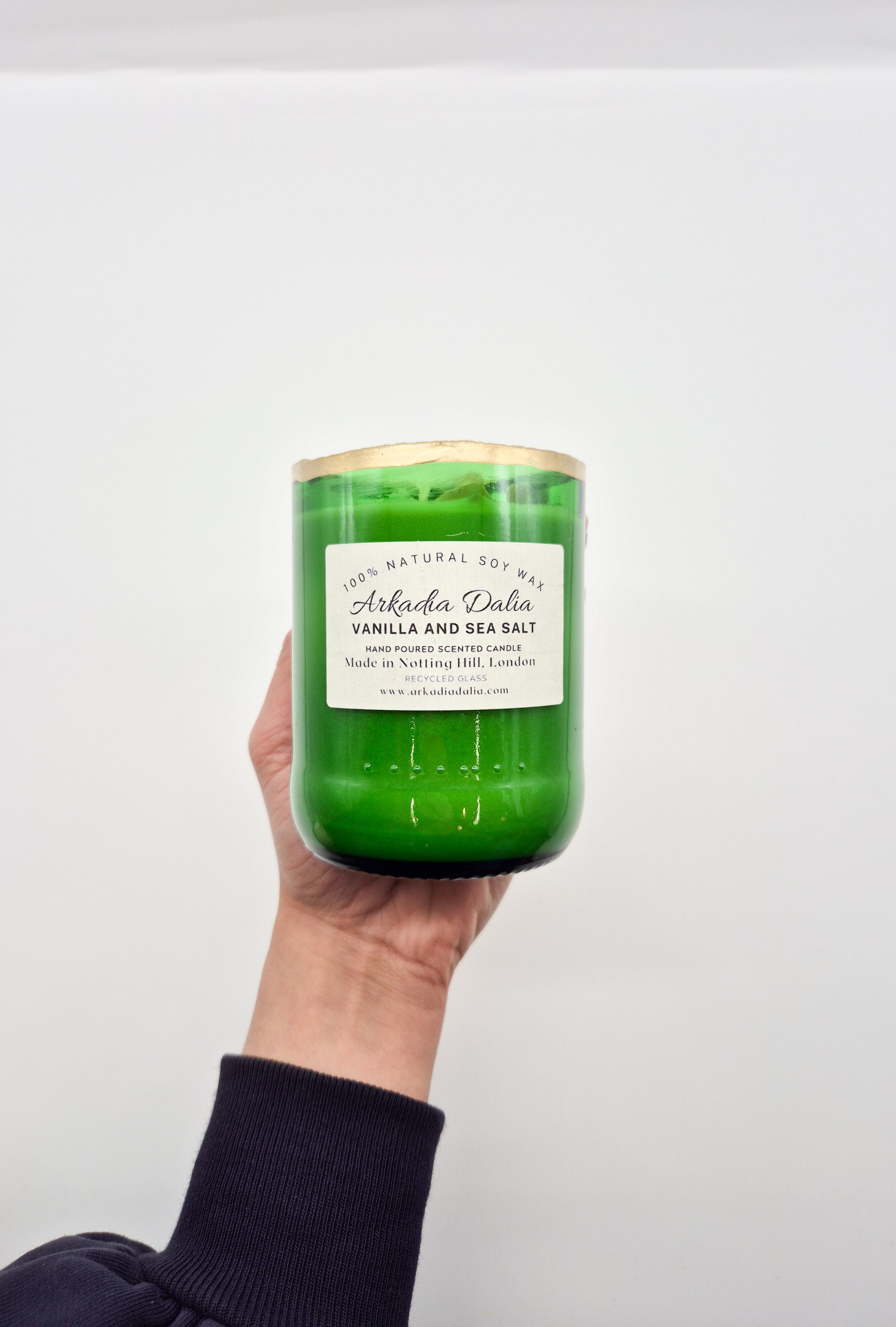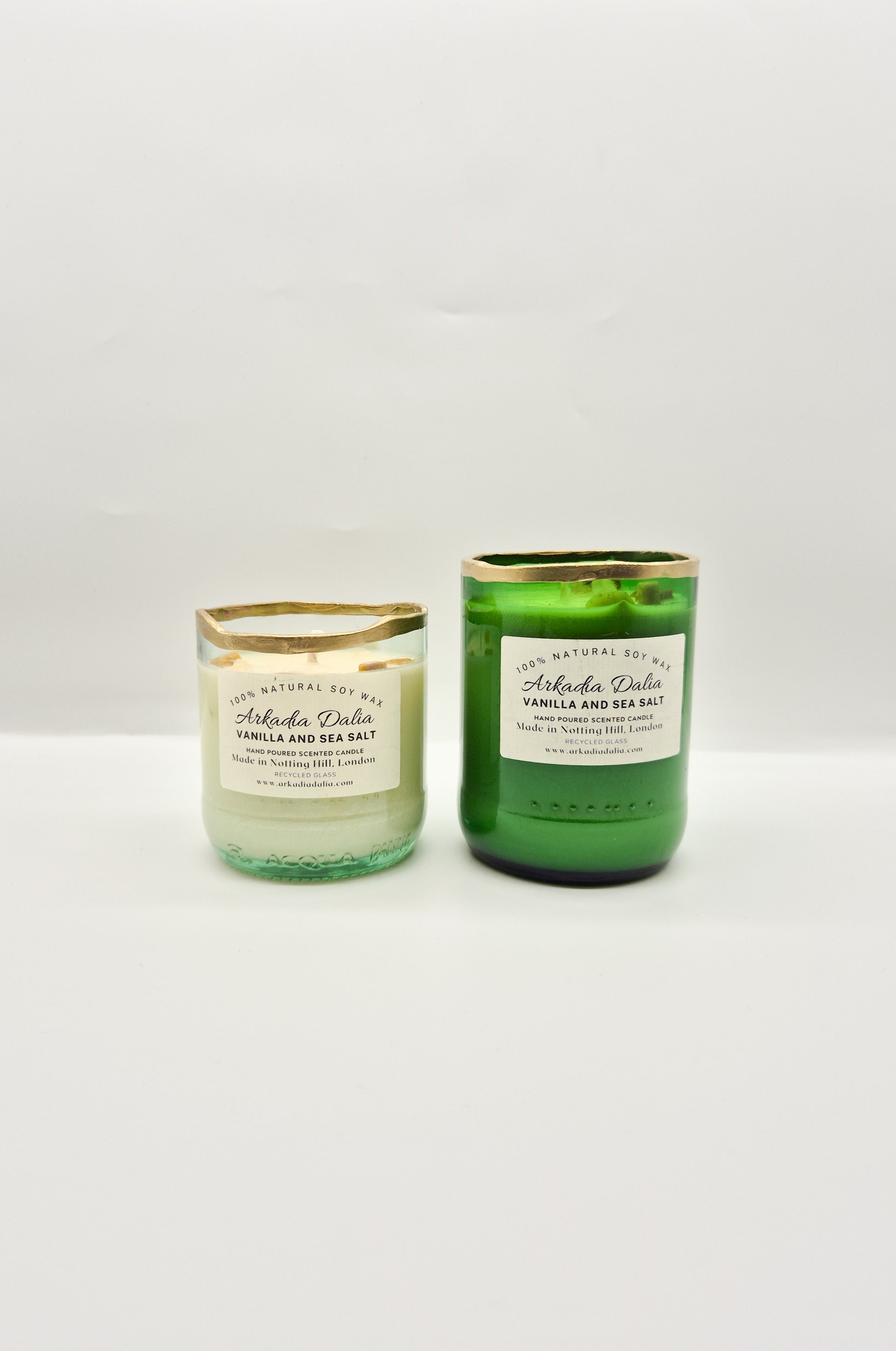 We make our own glass container from recycled glass bottles. Each container is decorated/painted by hand.