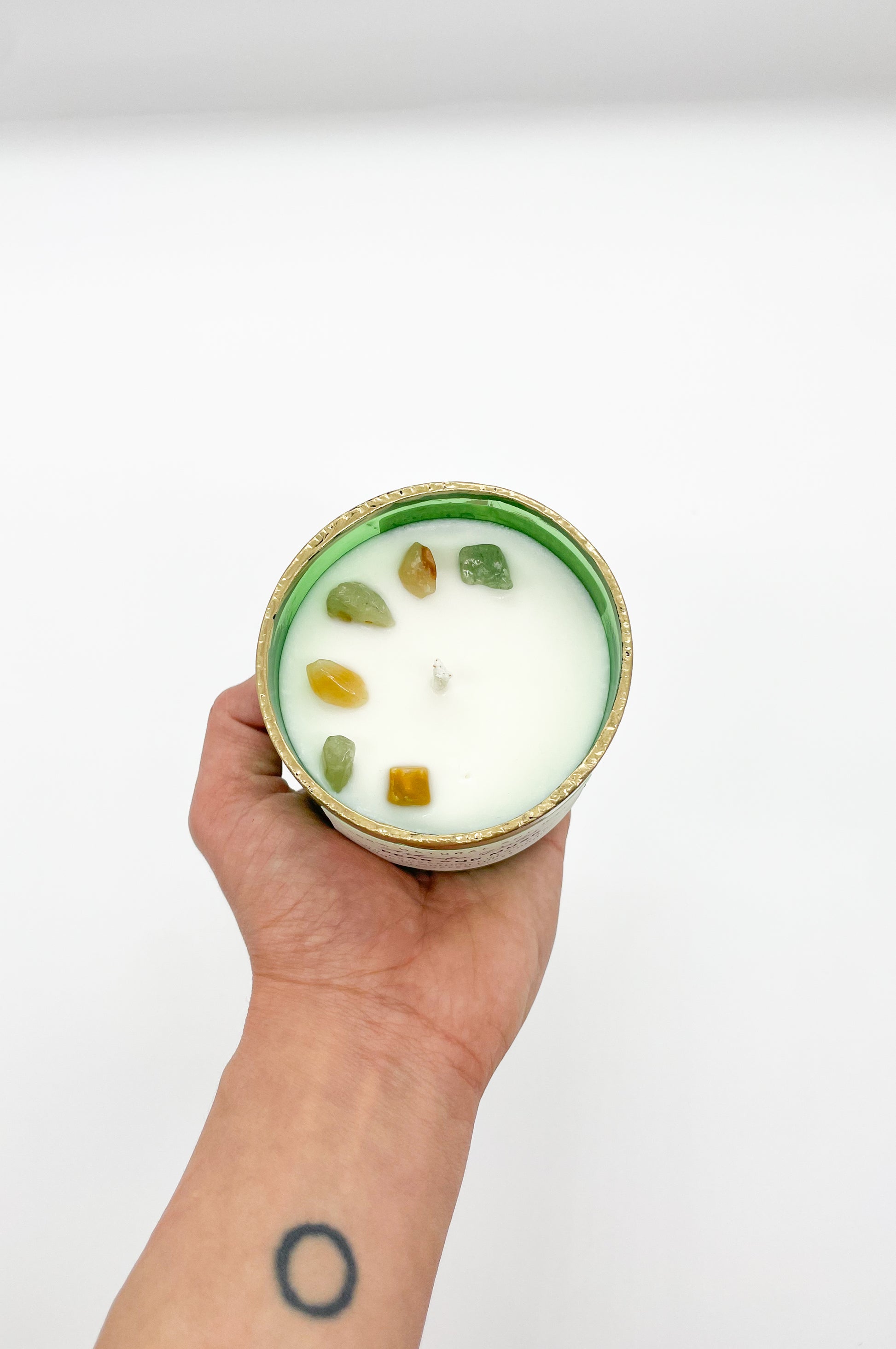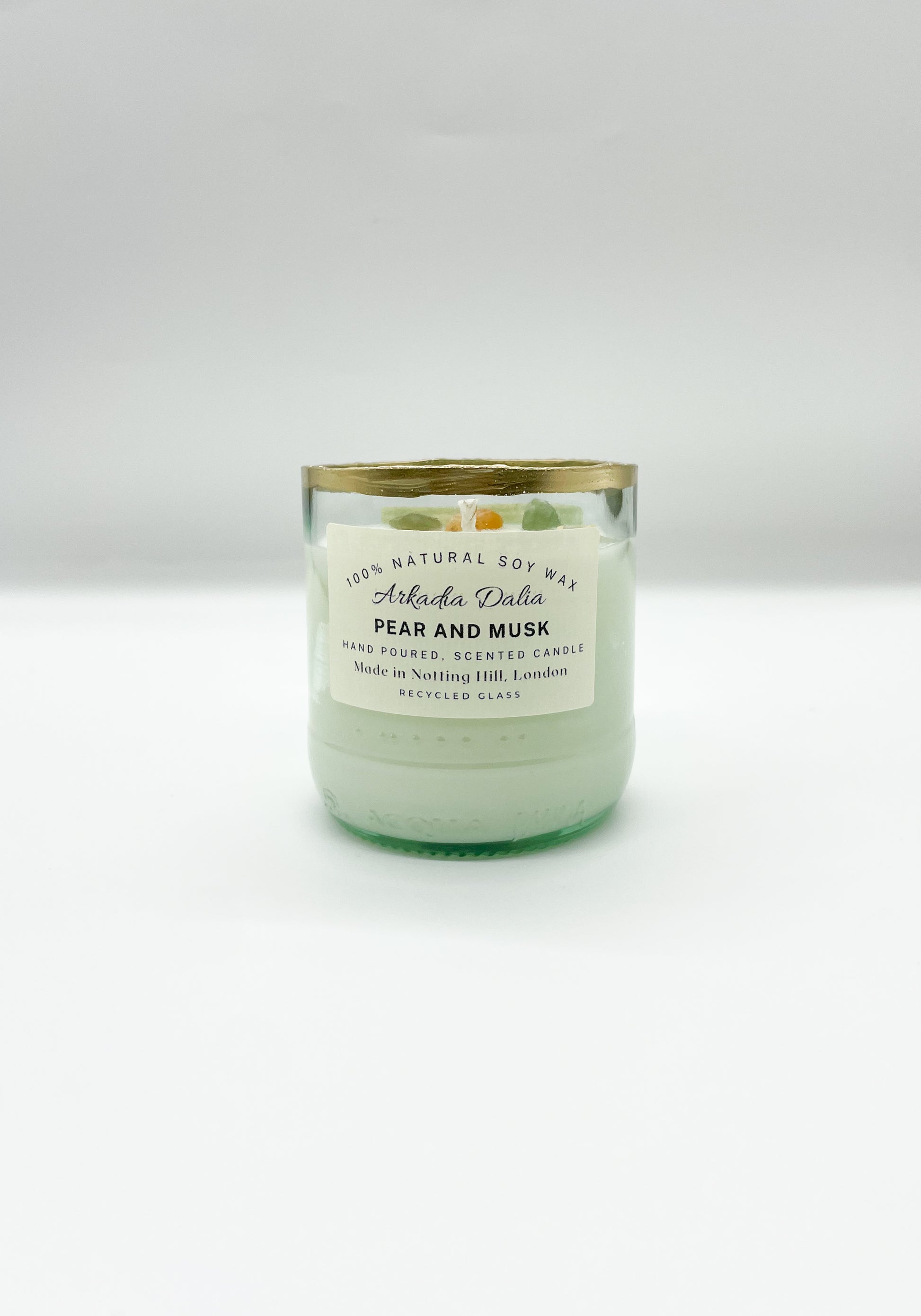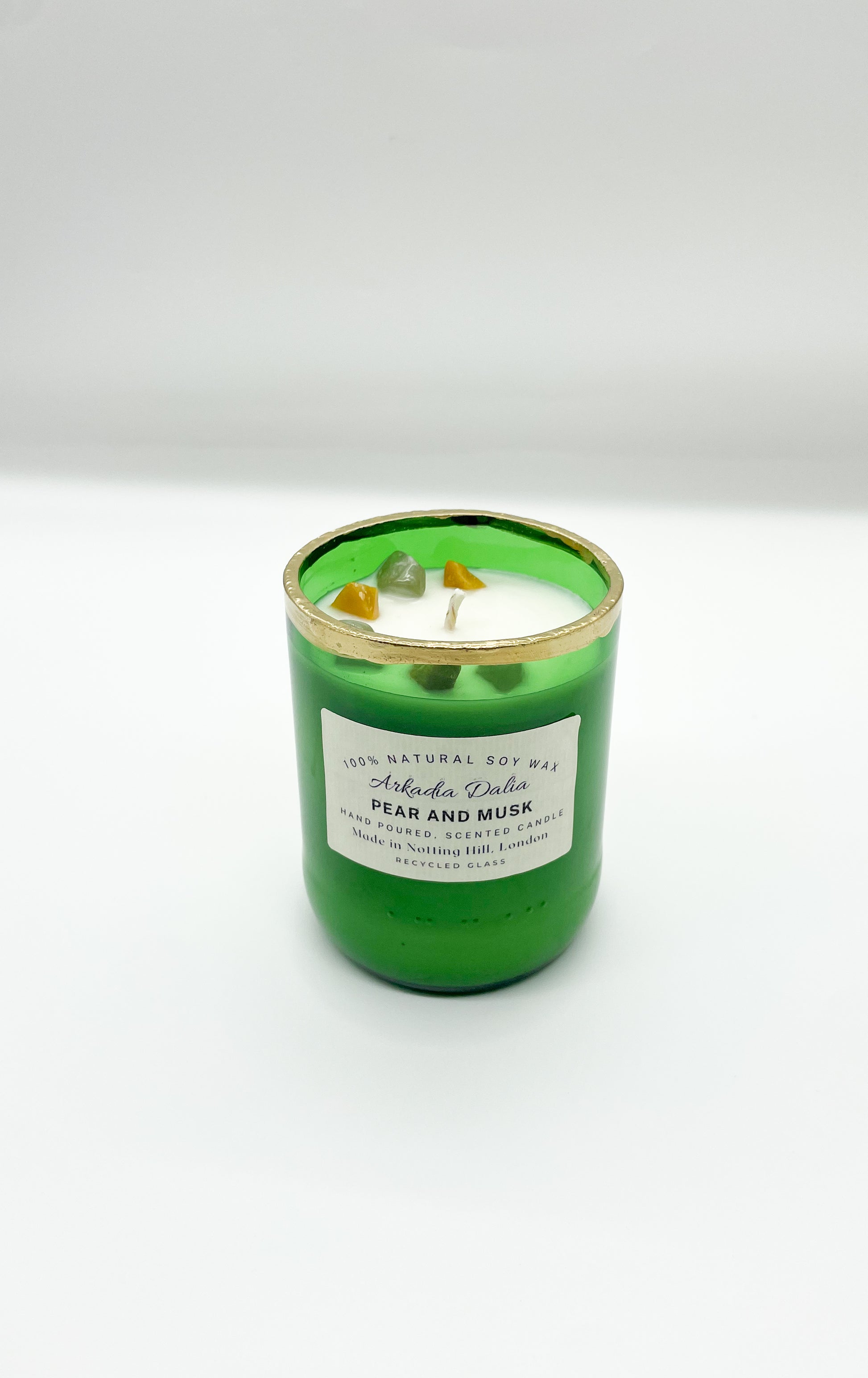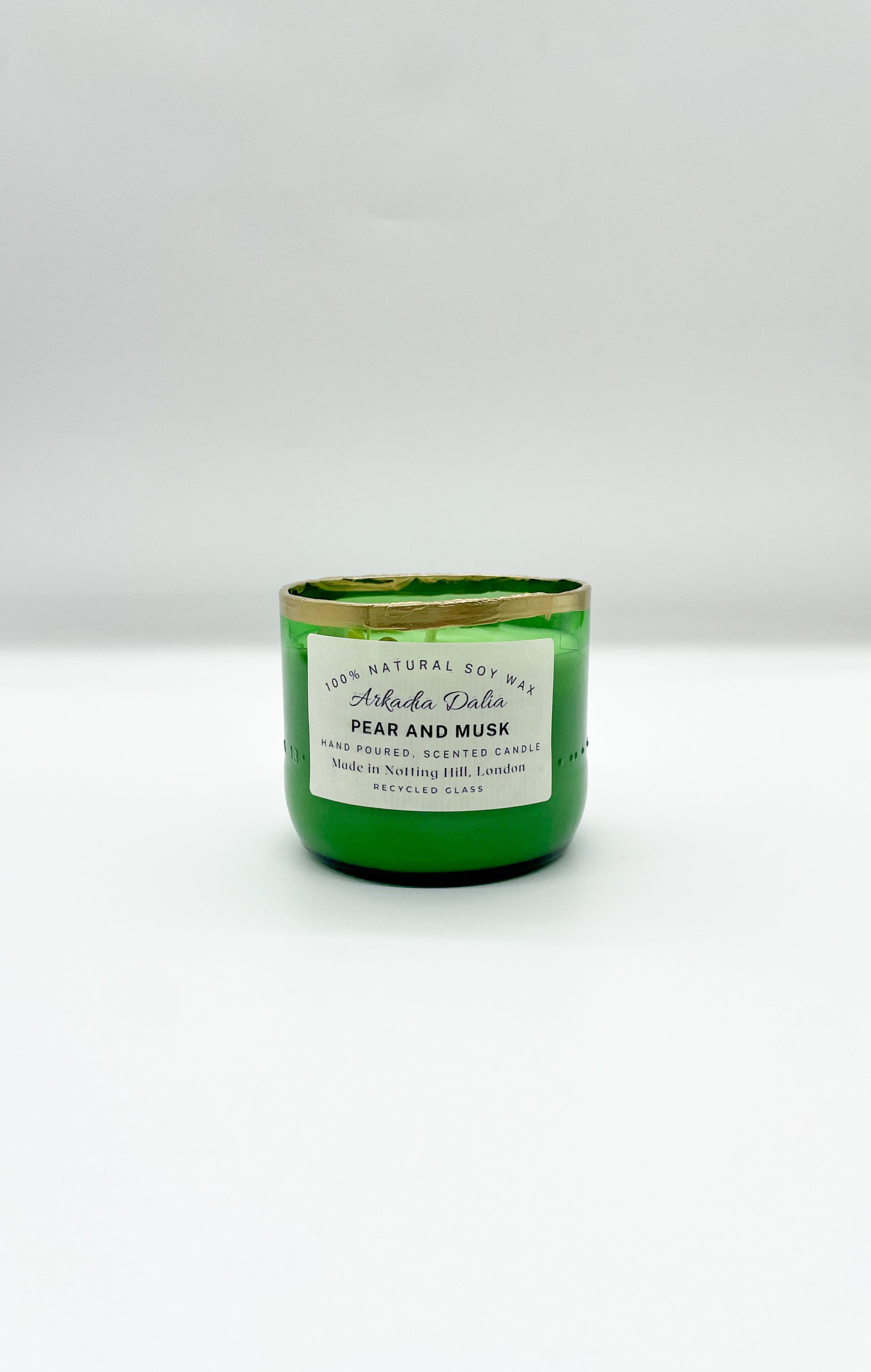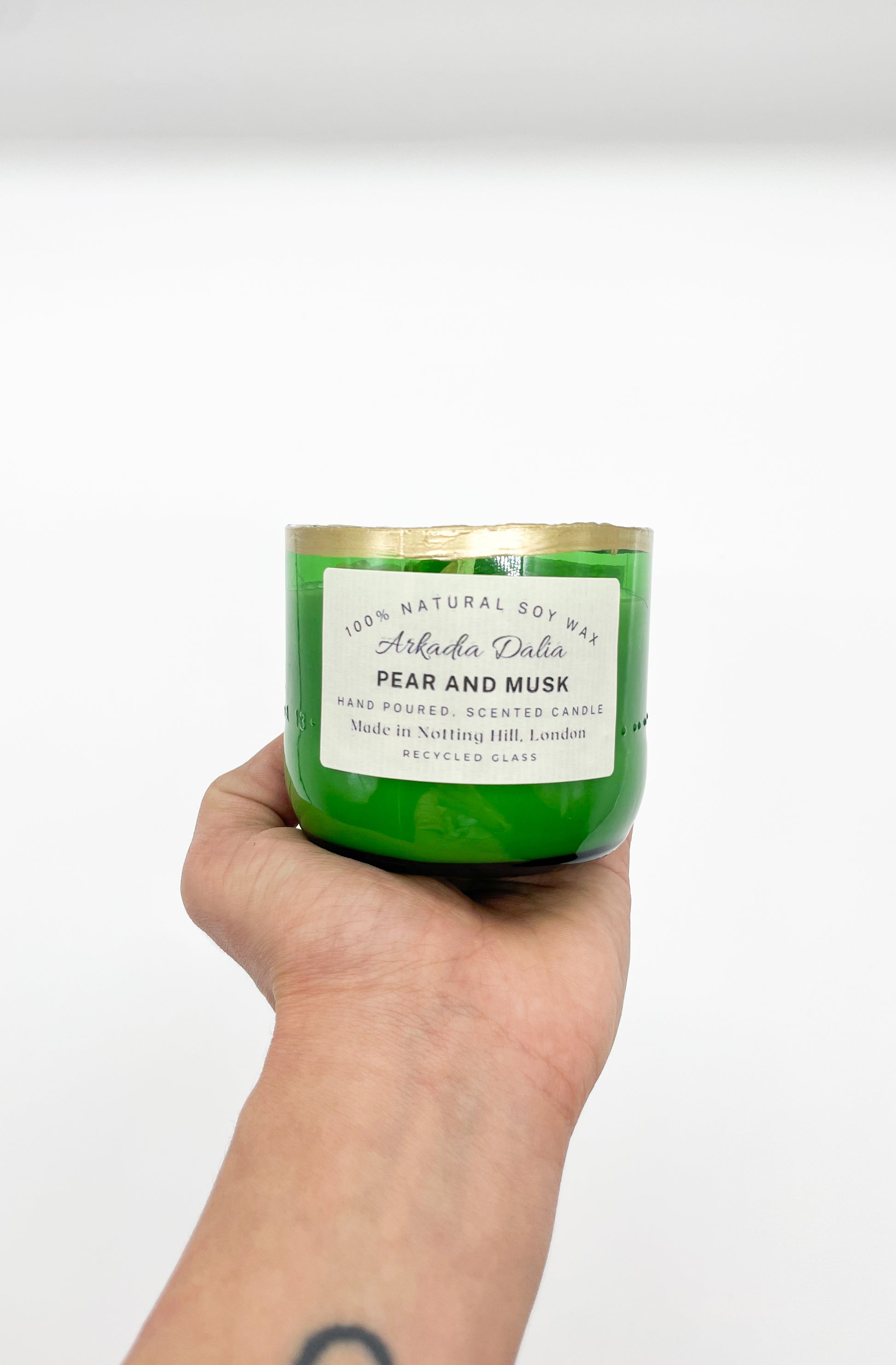 We make our own glass container from recycled glass bottles. Each container is decorated/painted by hand.