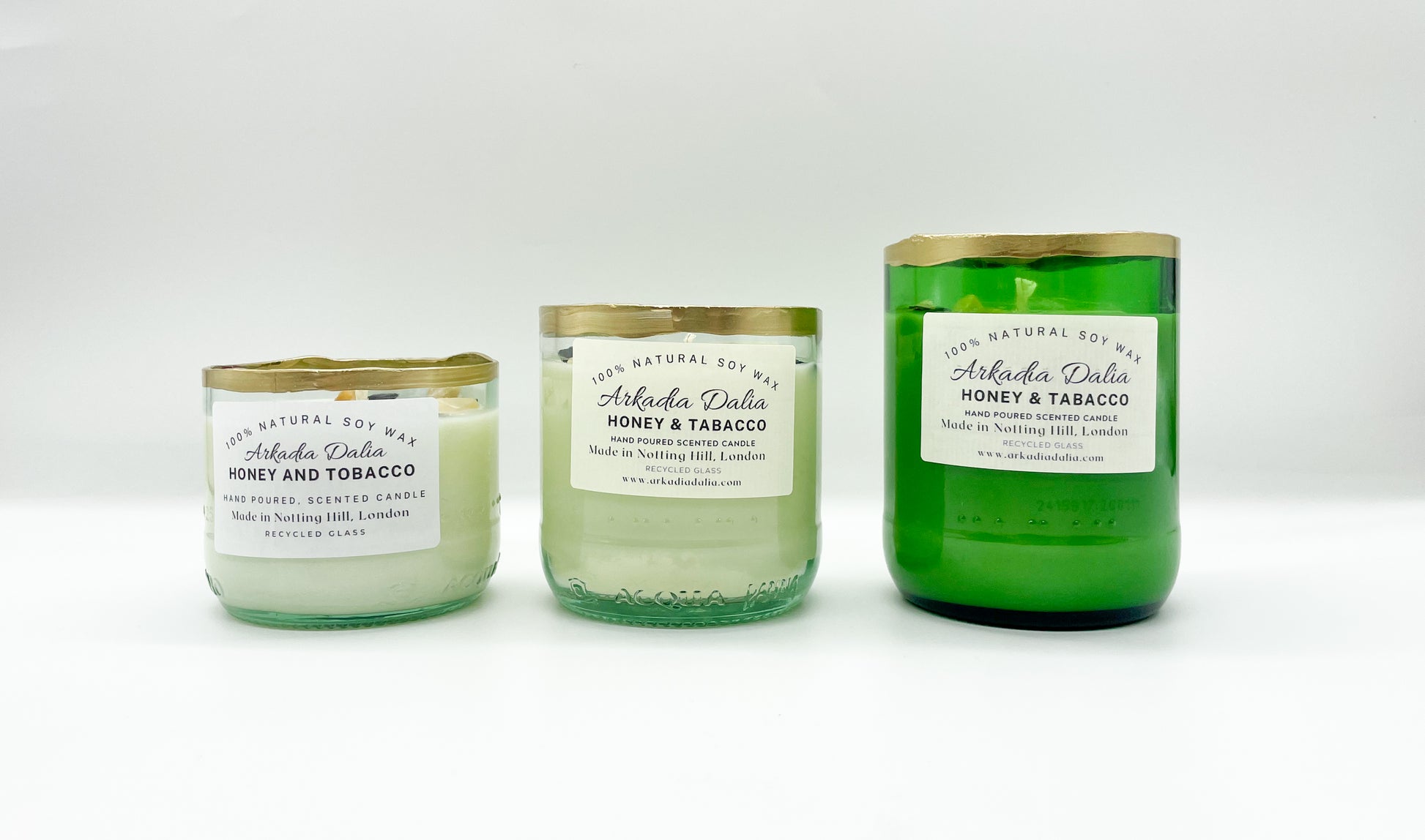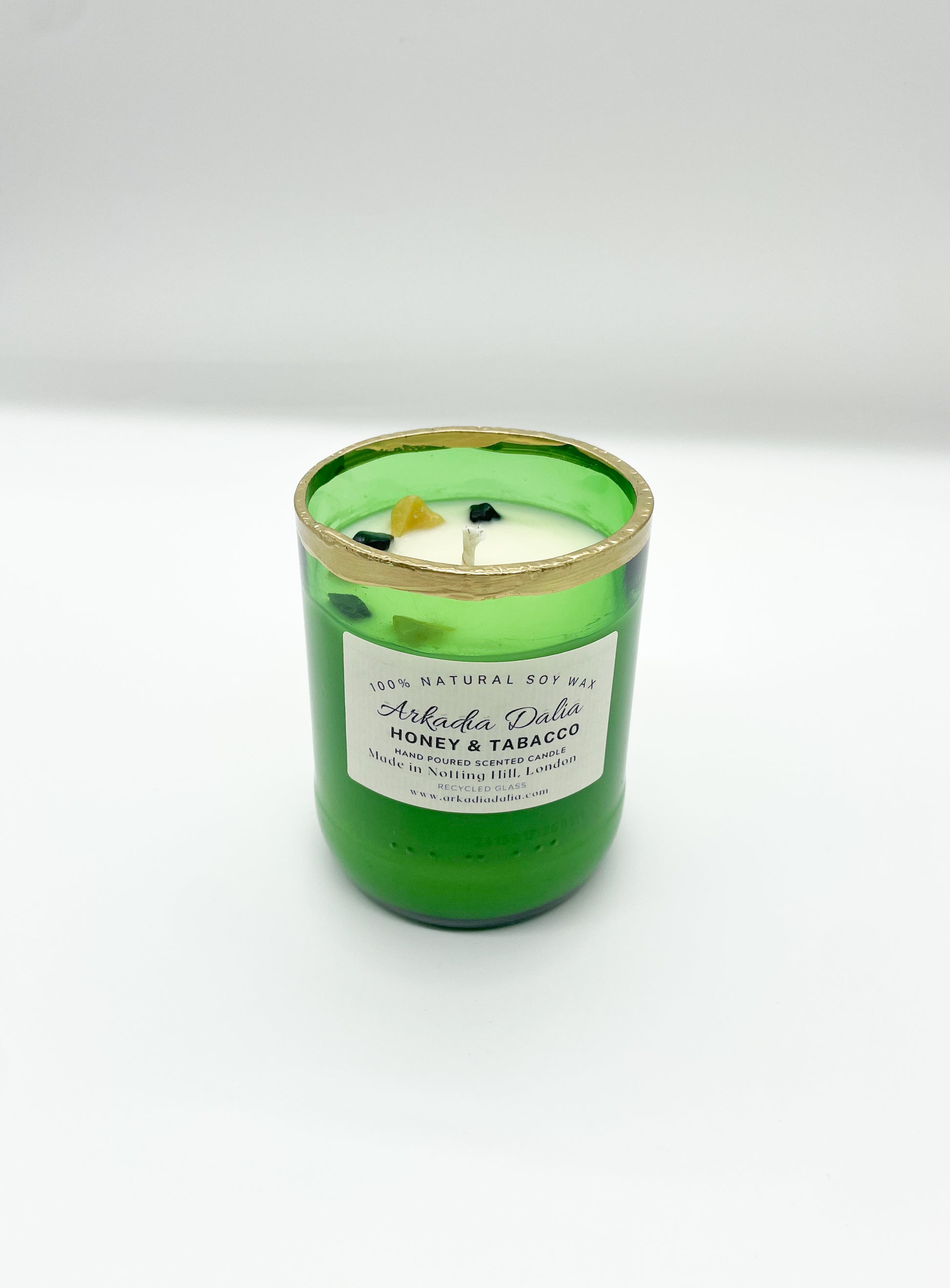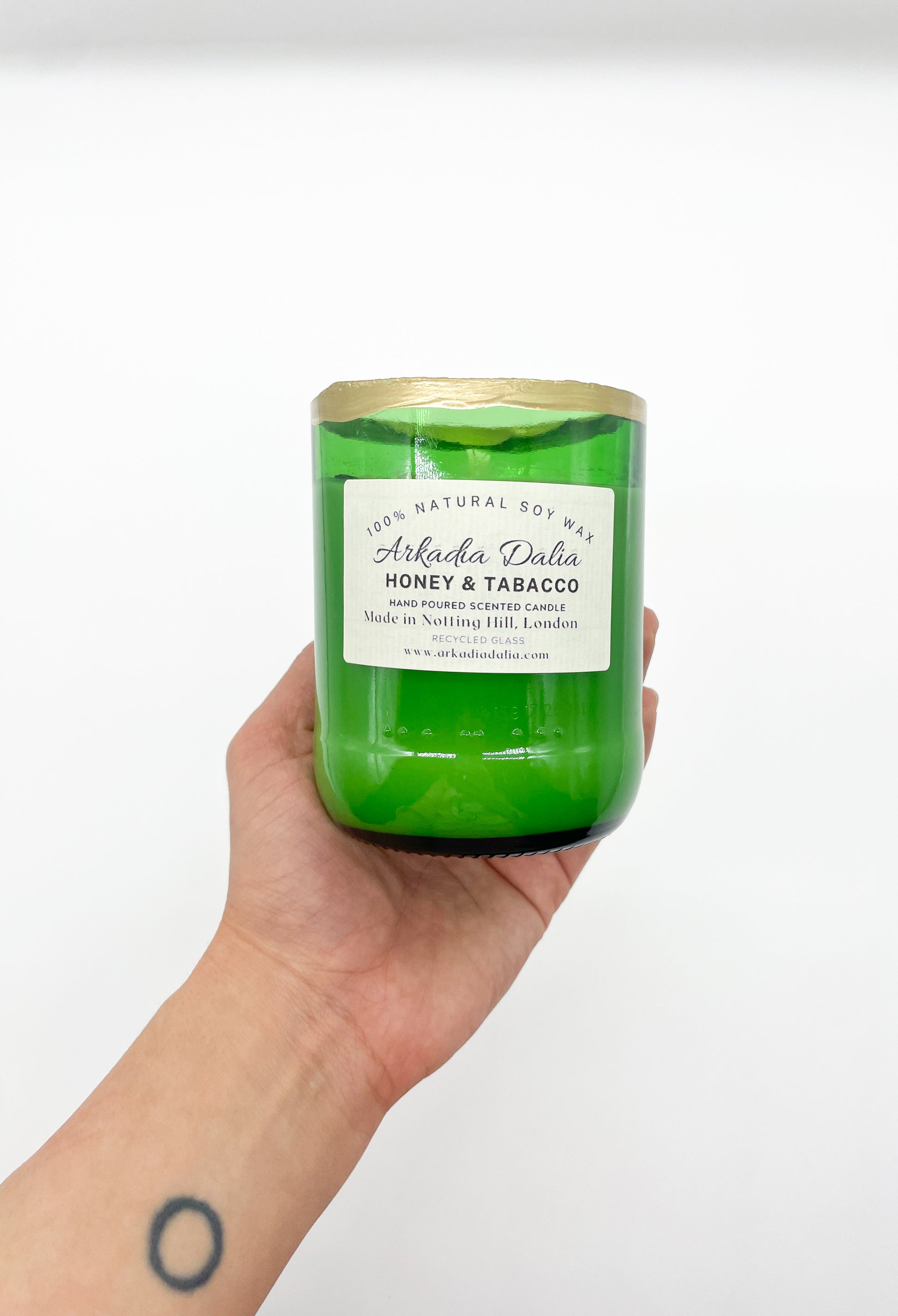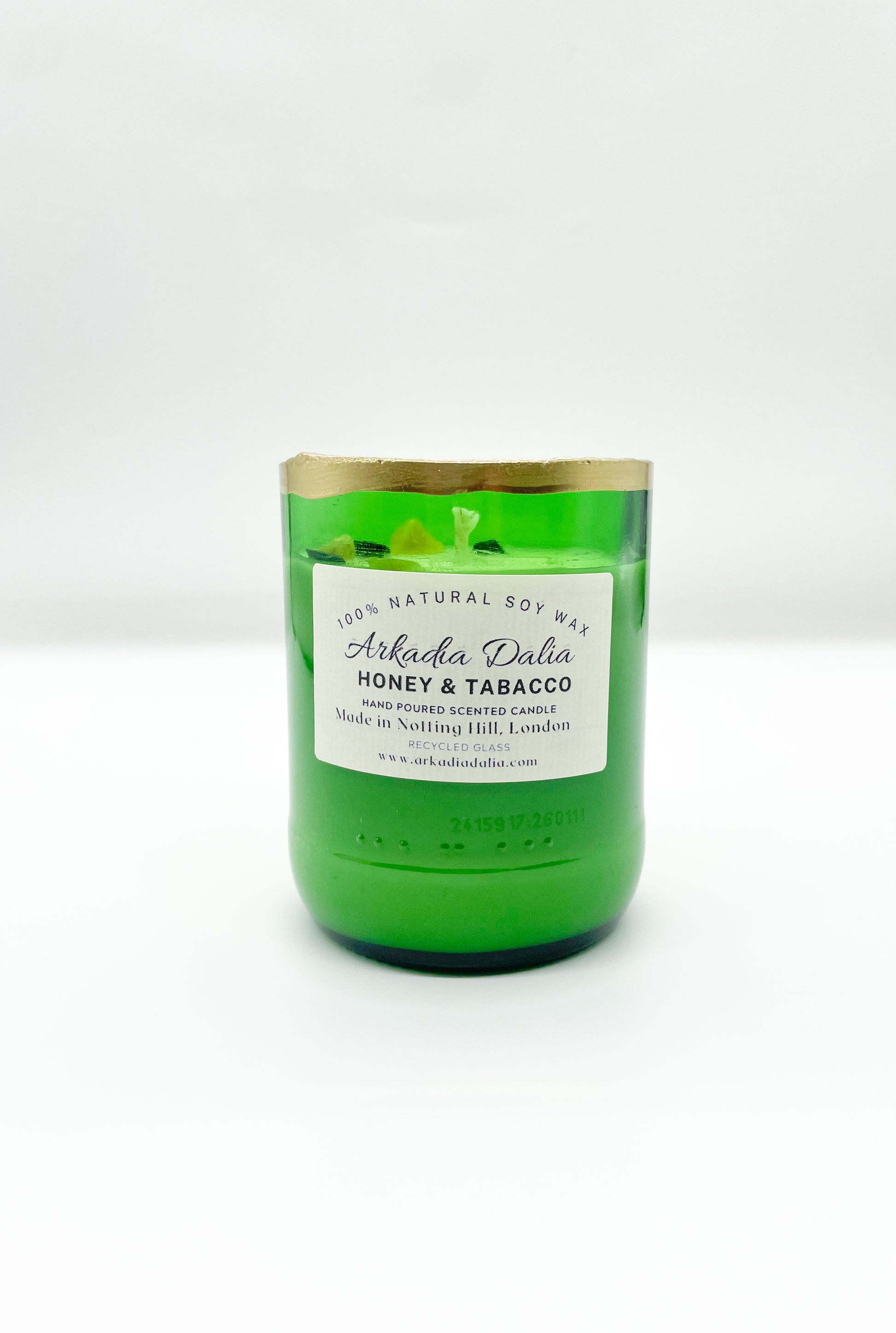 We make our own glass container from recycled glass bottles. Each container is decorated/painted by hand.