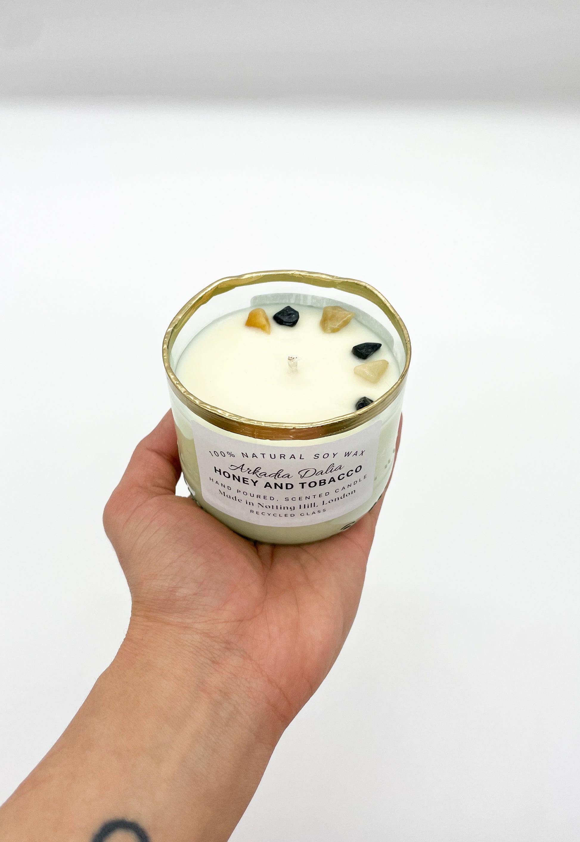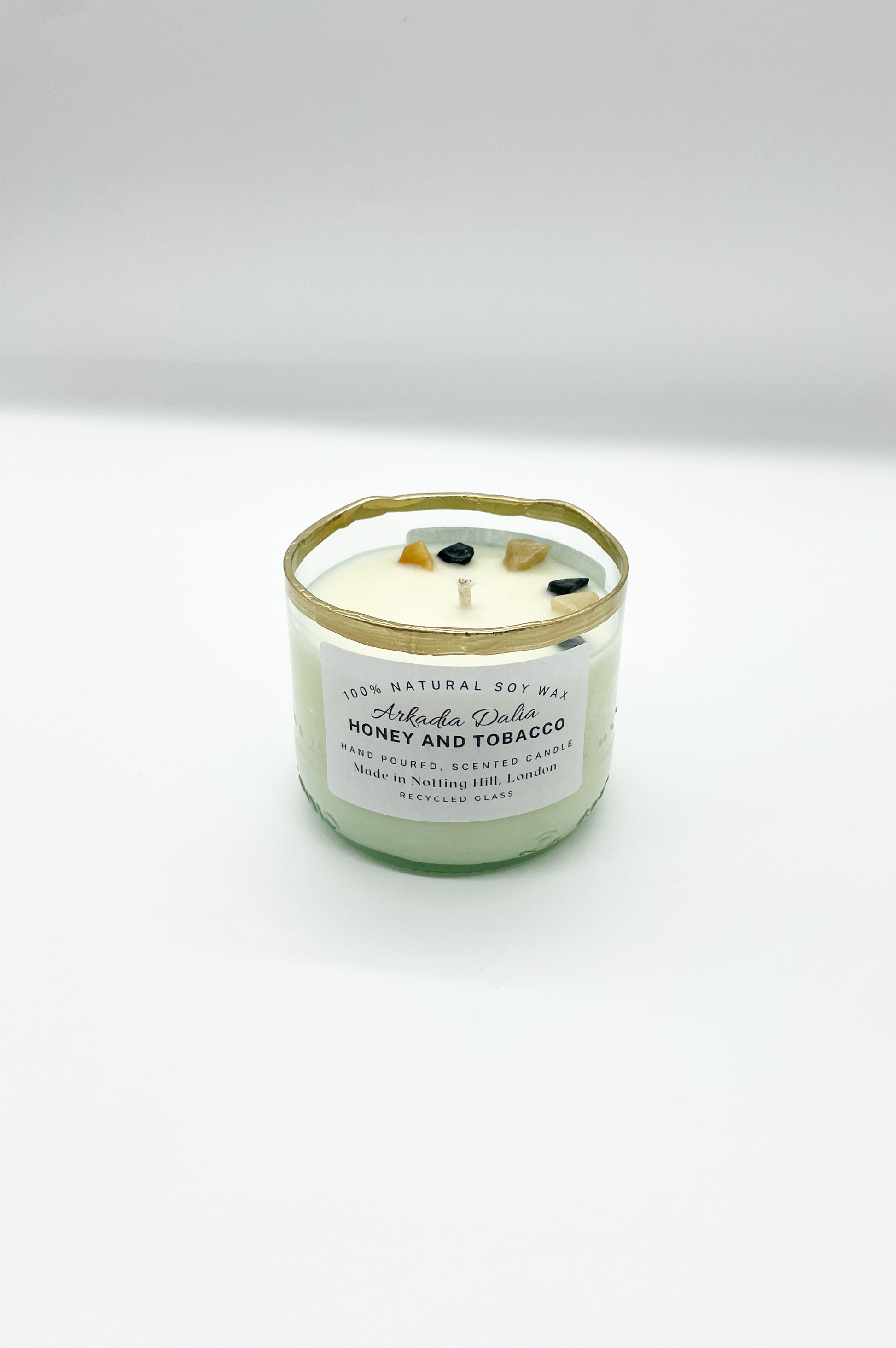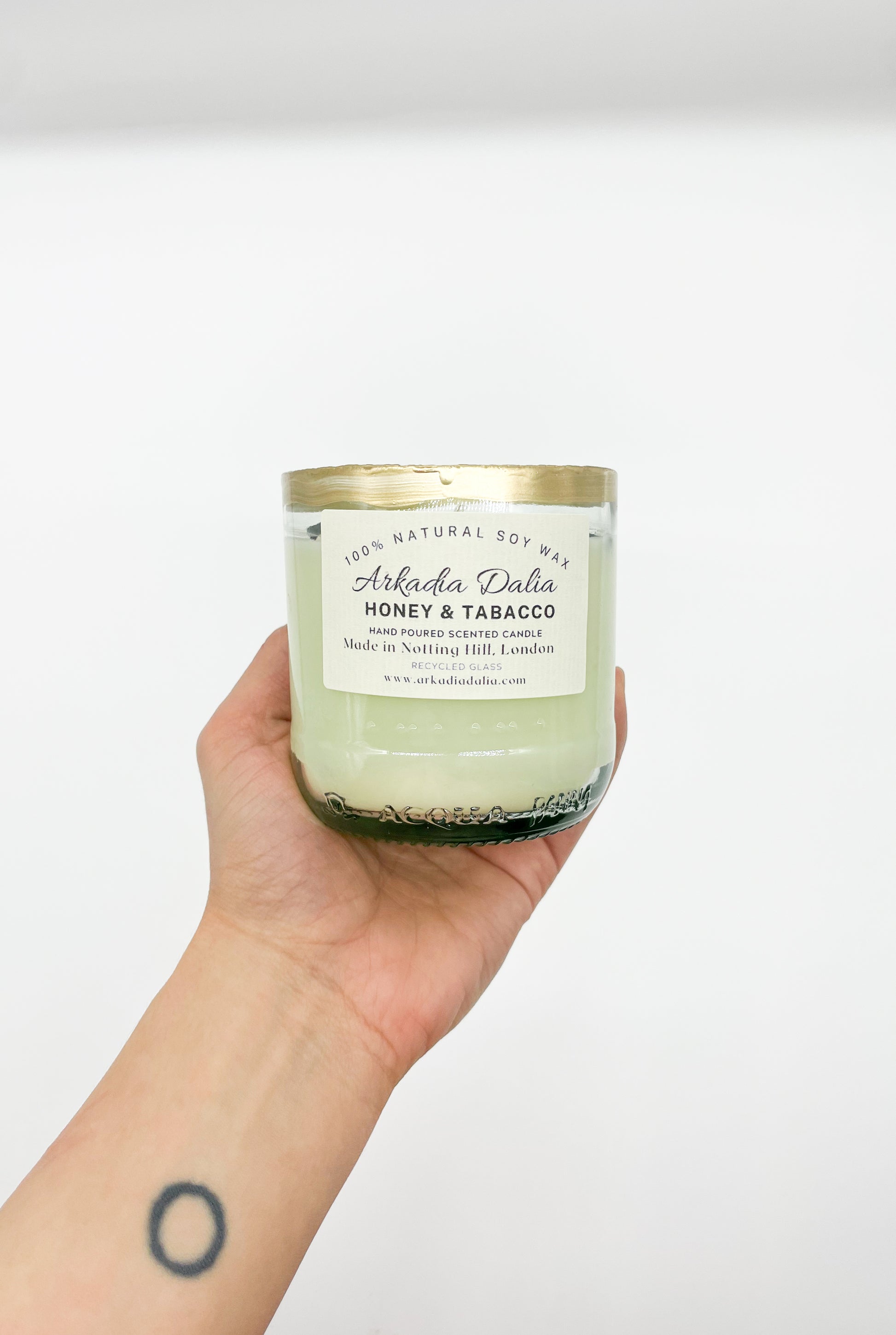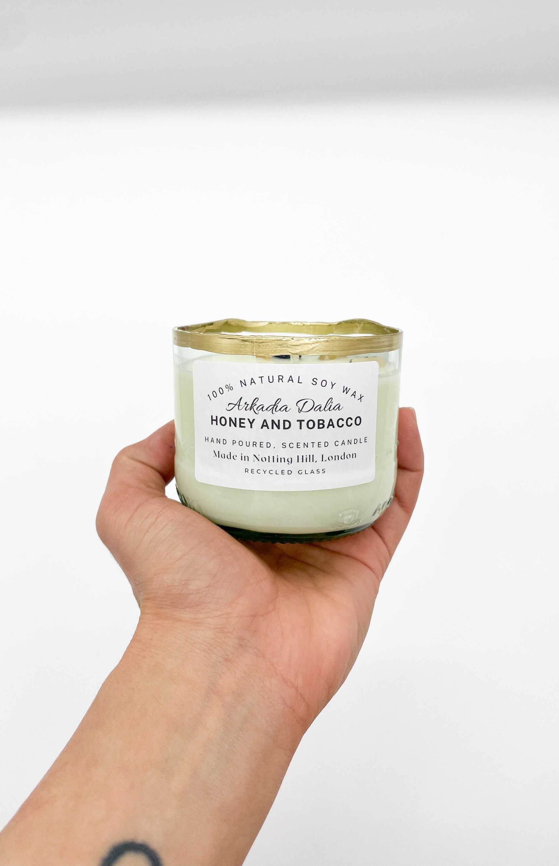 We make our own glass container from recycled glass bottles. Each container is decorated/painted by hand.