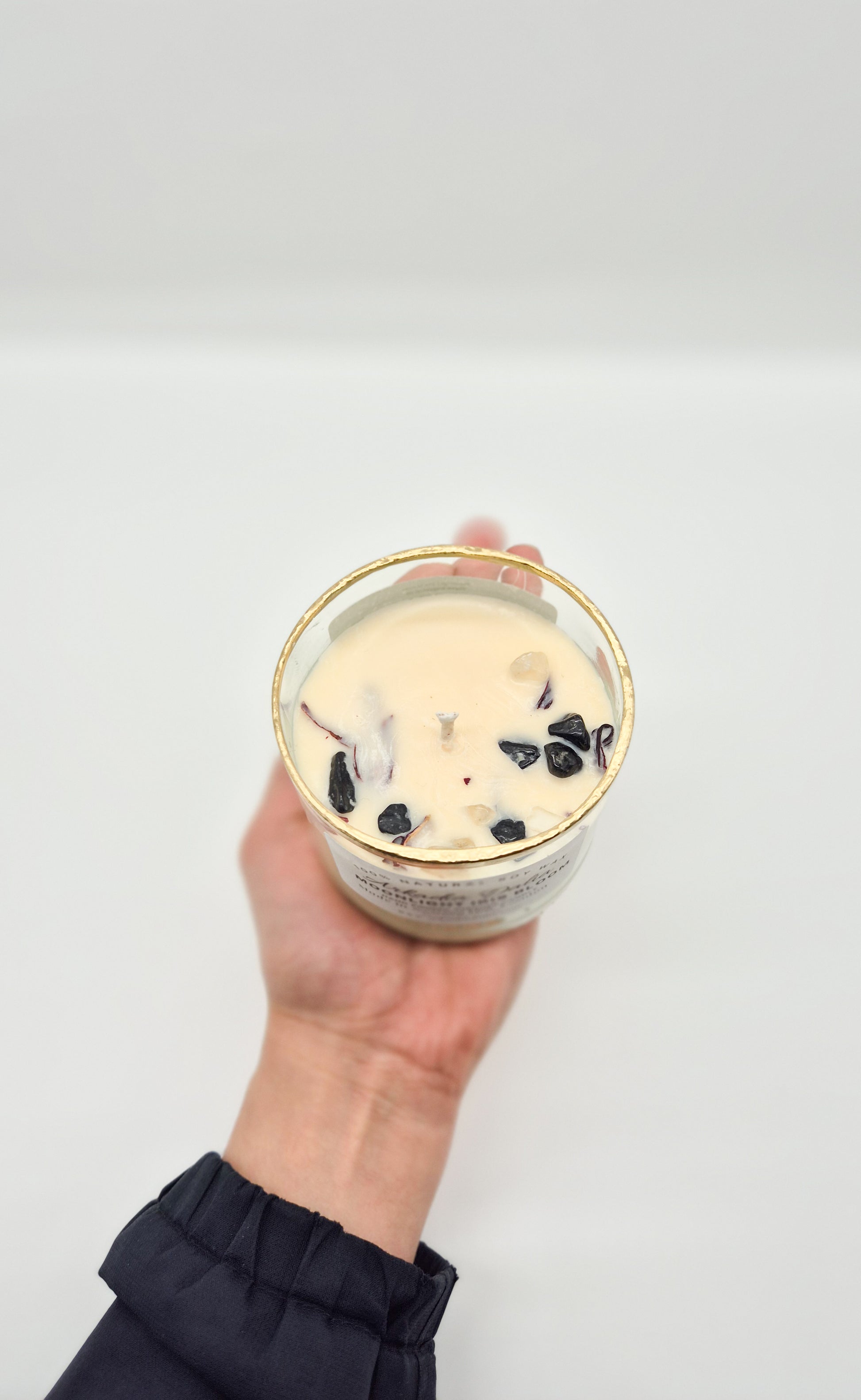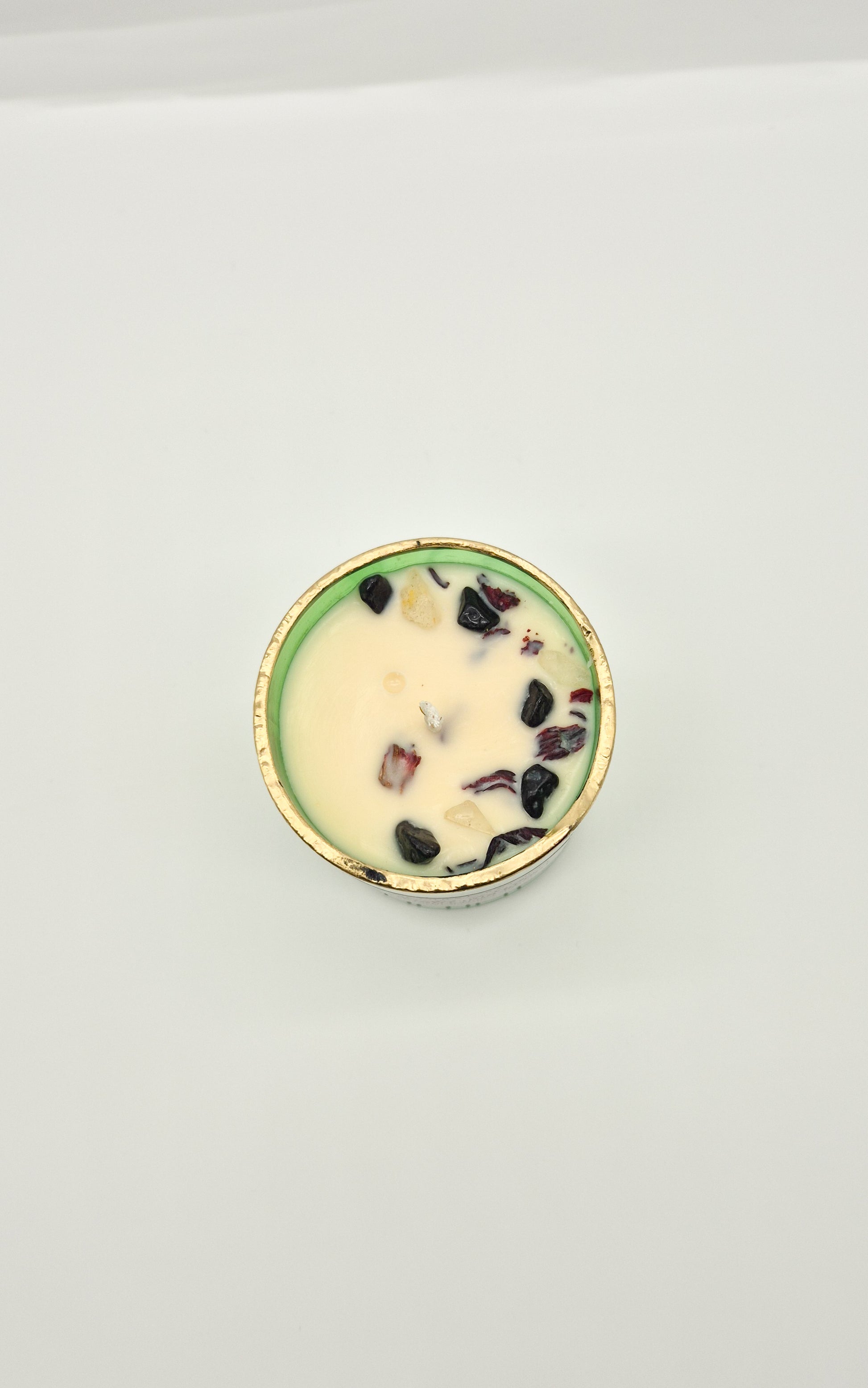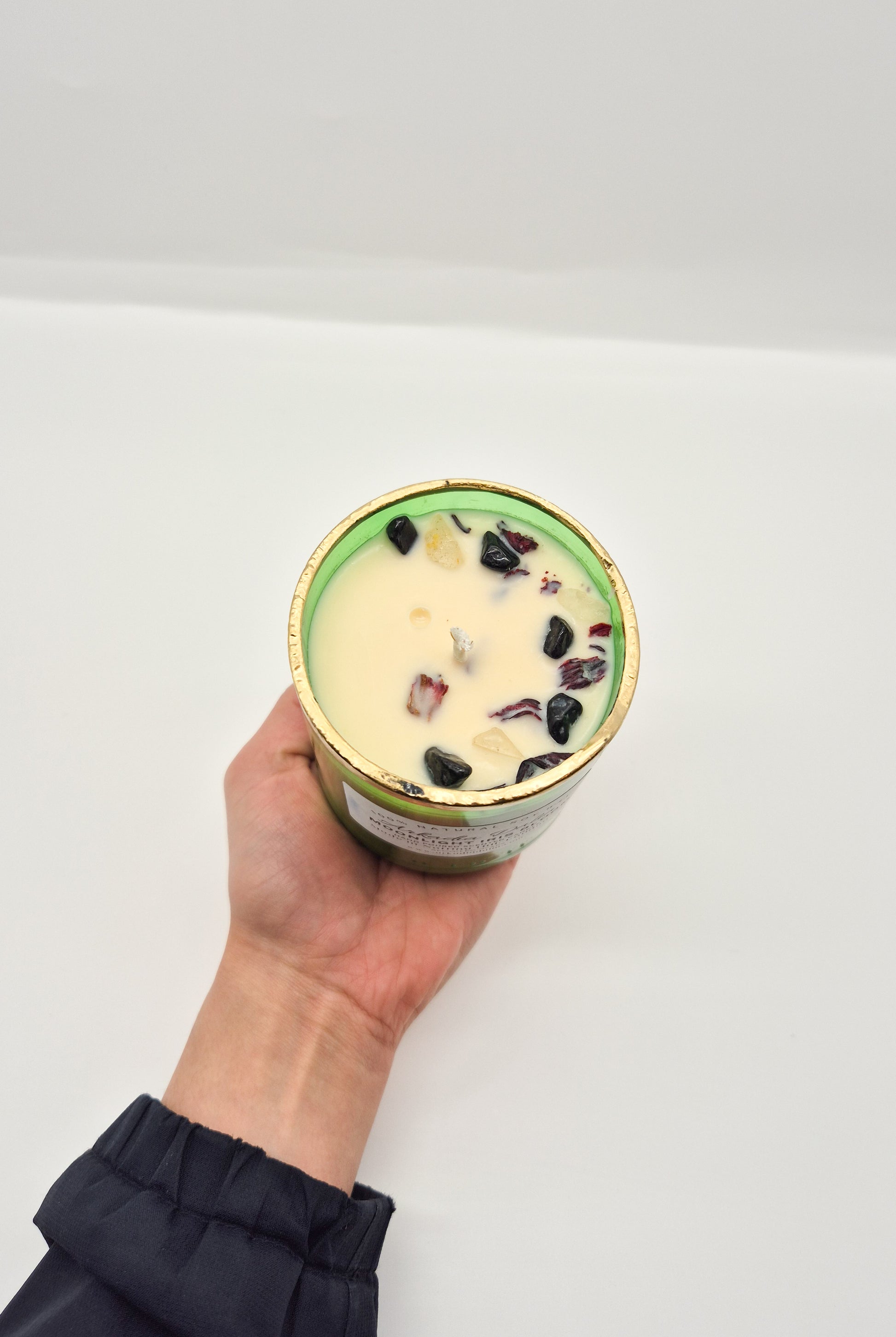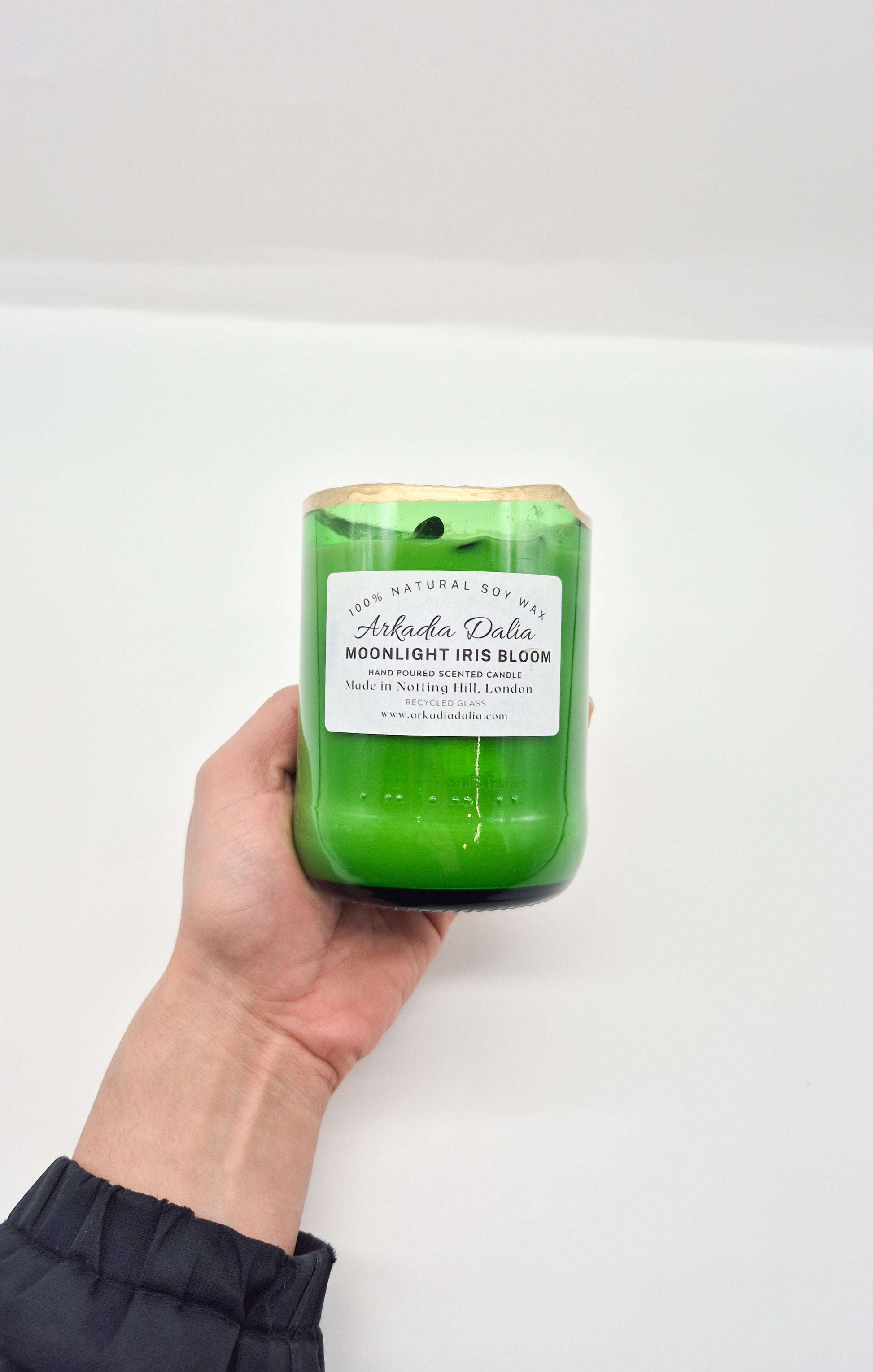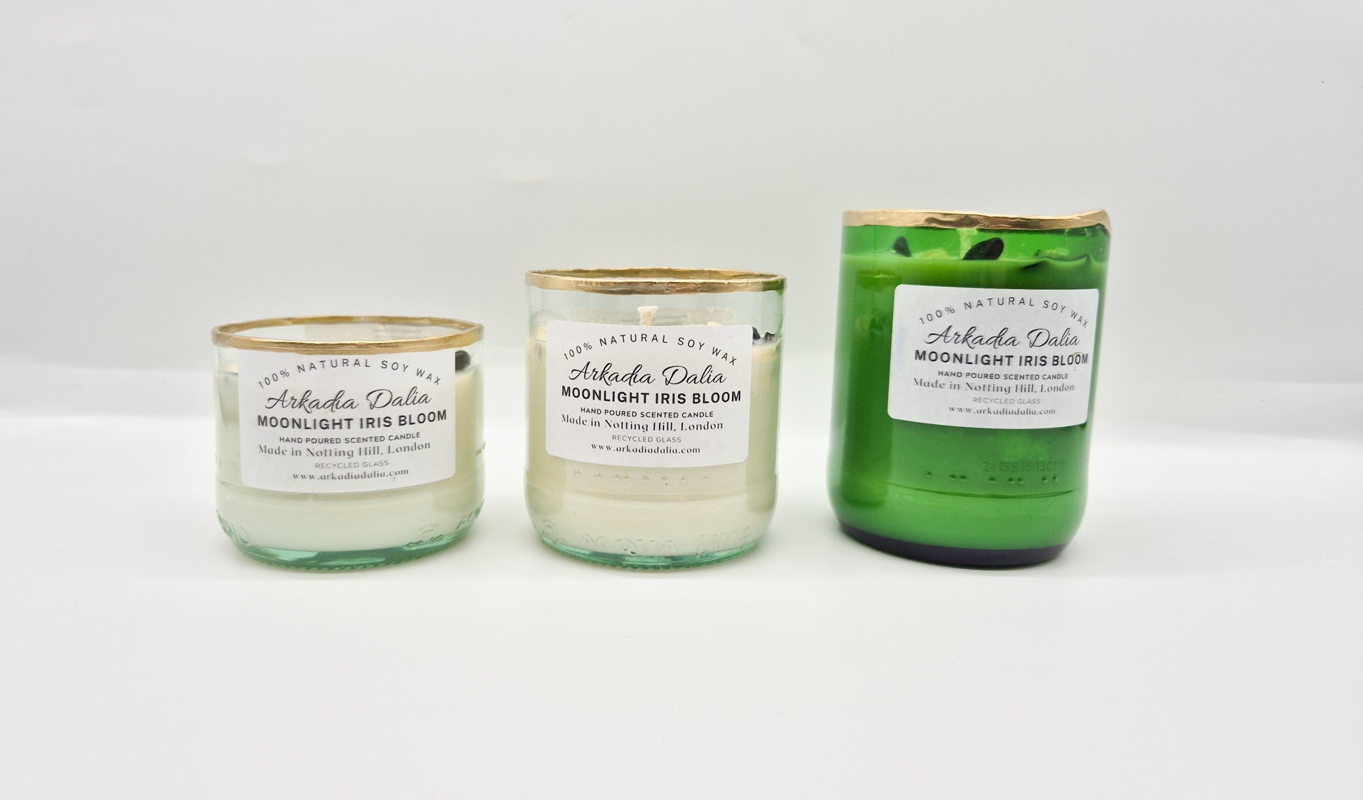 We make our own glass container from recycled glass bottles. Each container is decorated/painted by hand.