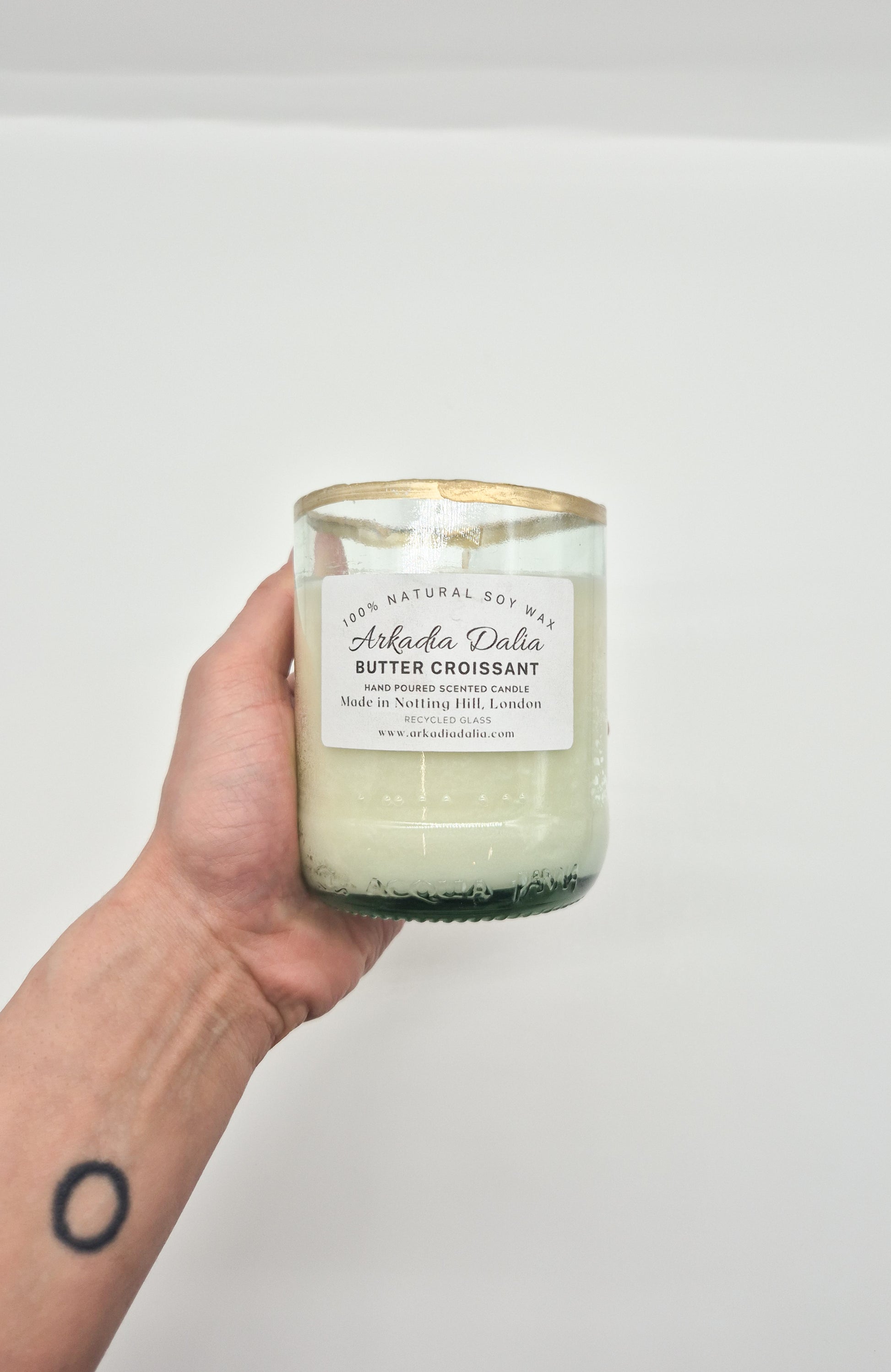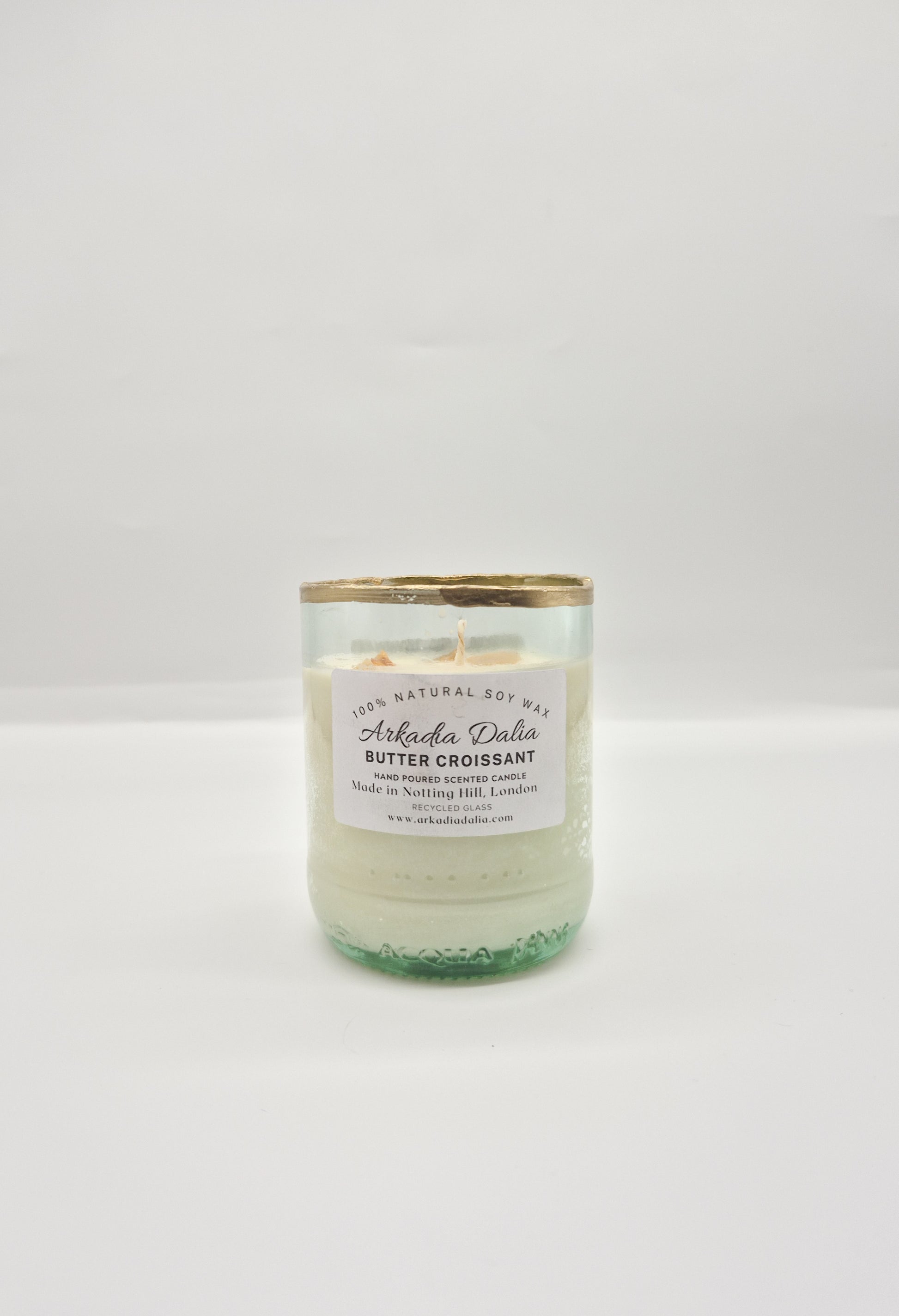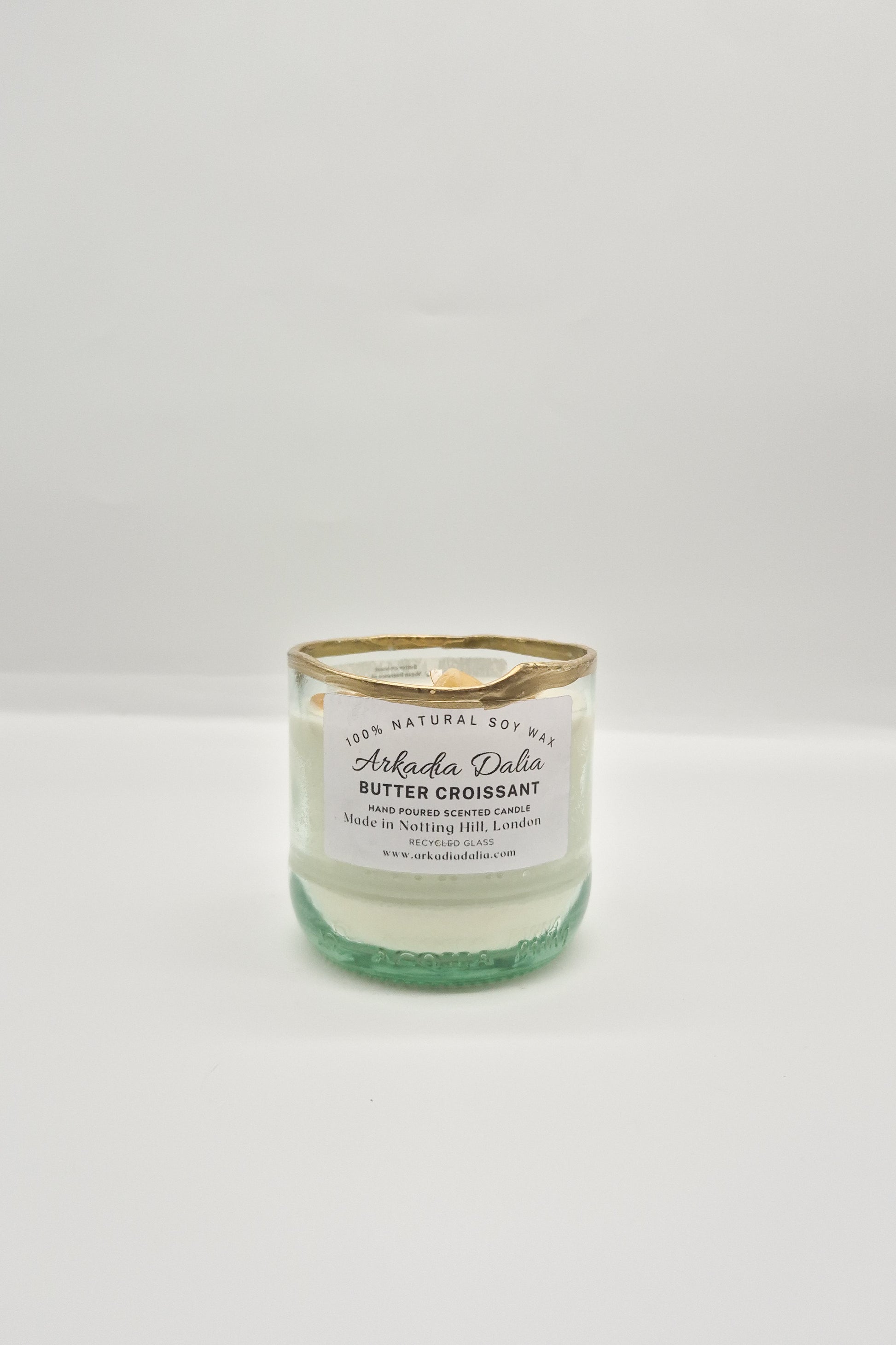 We make our own glass container from recycled glass bottles. Each container is hand painted.