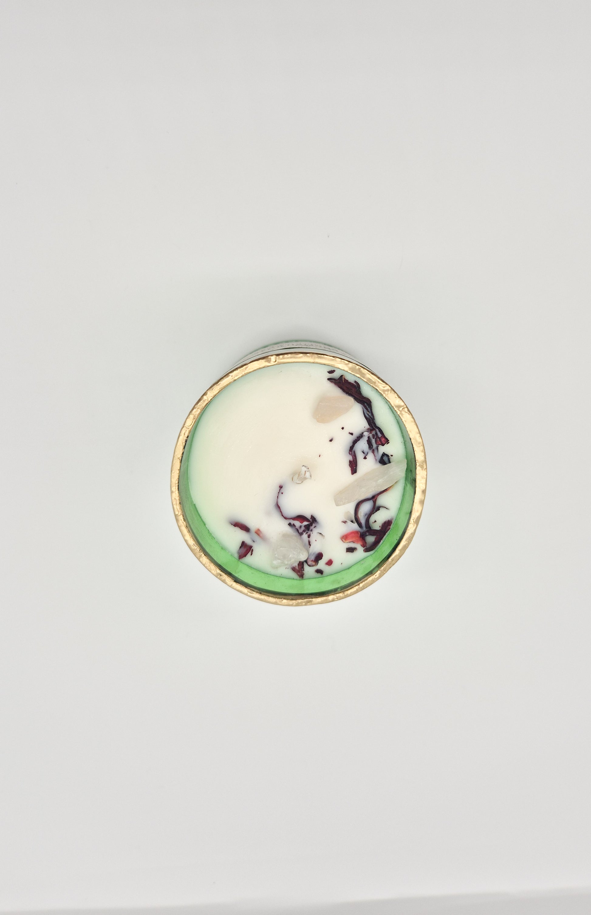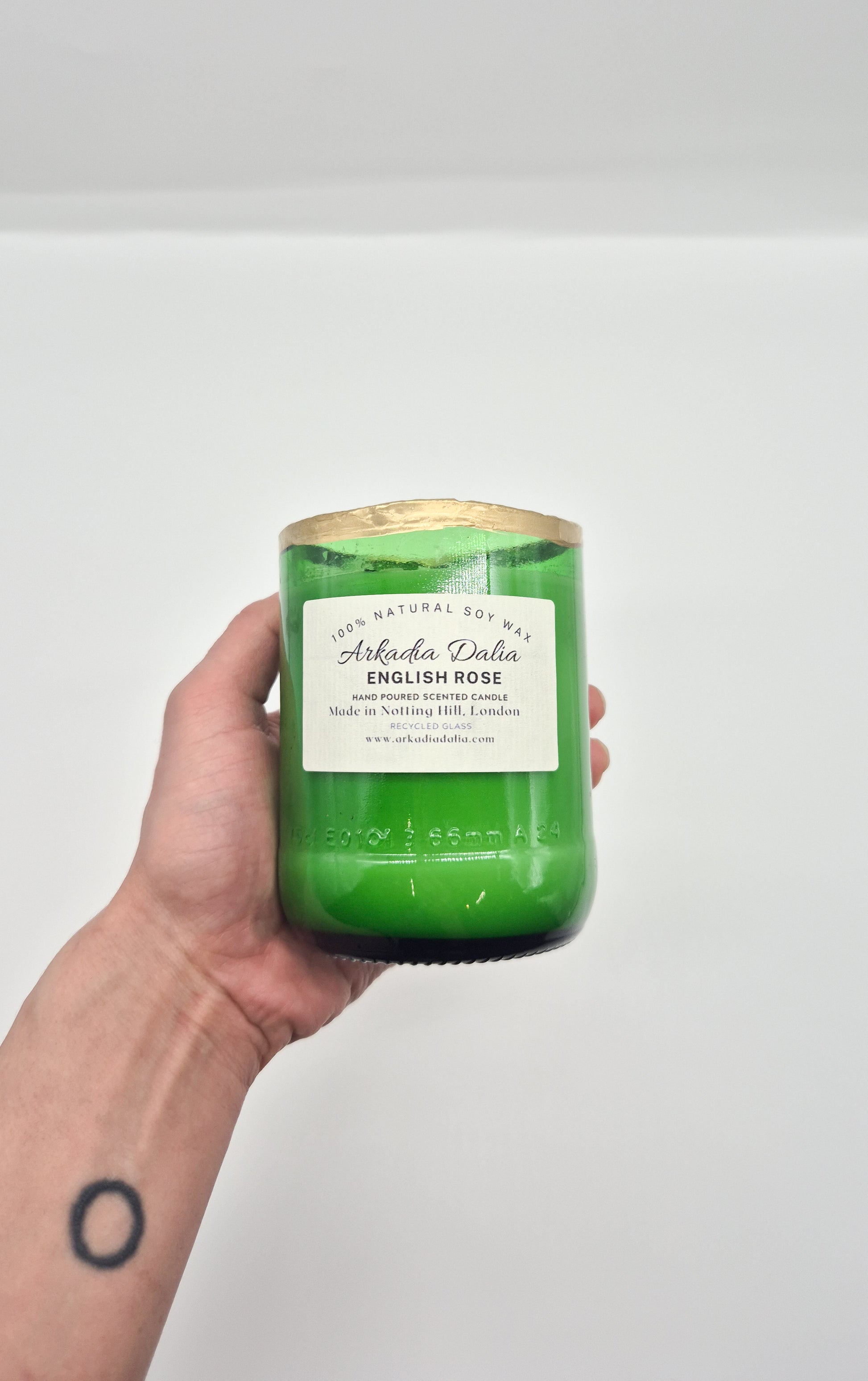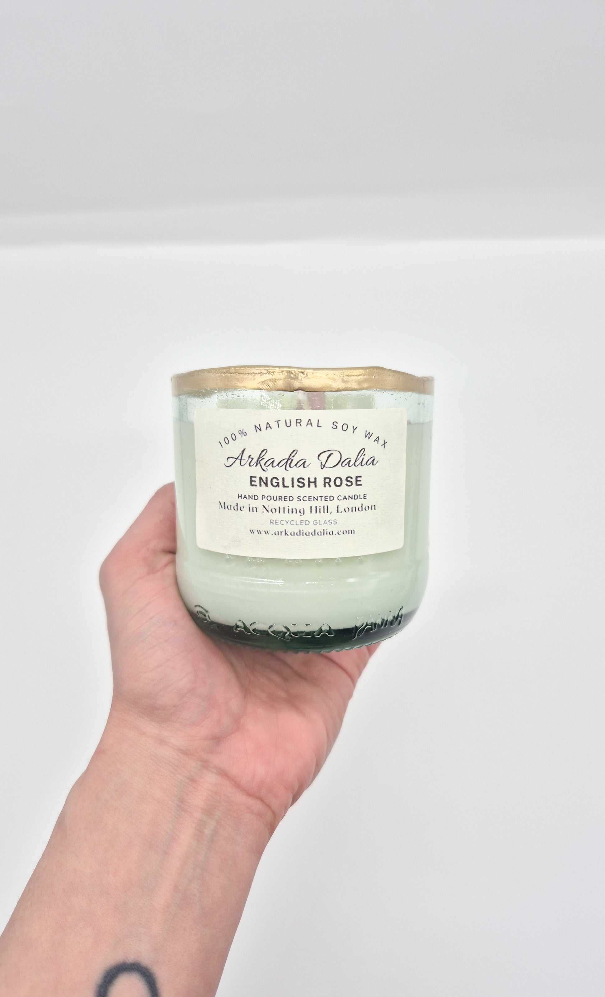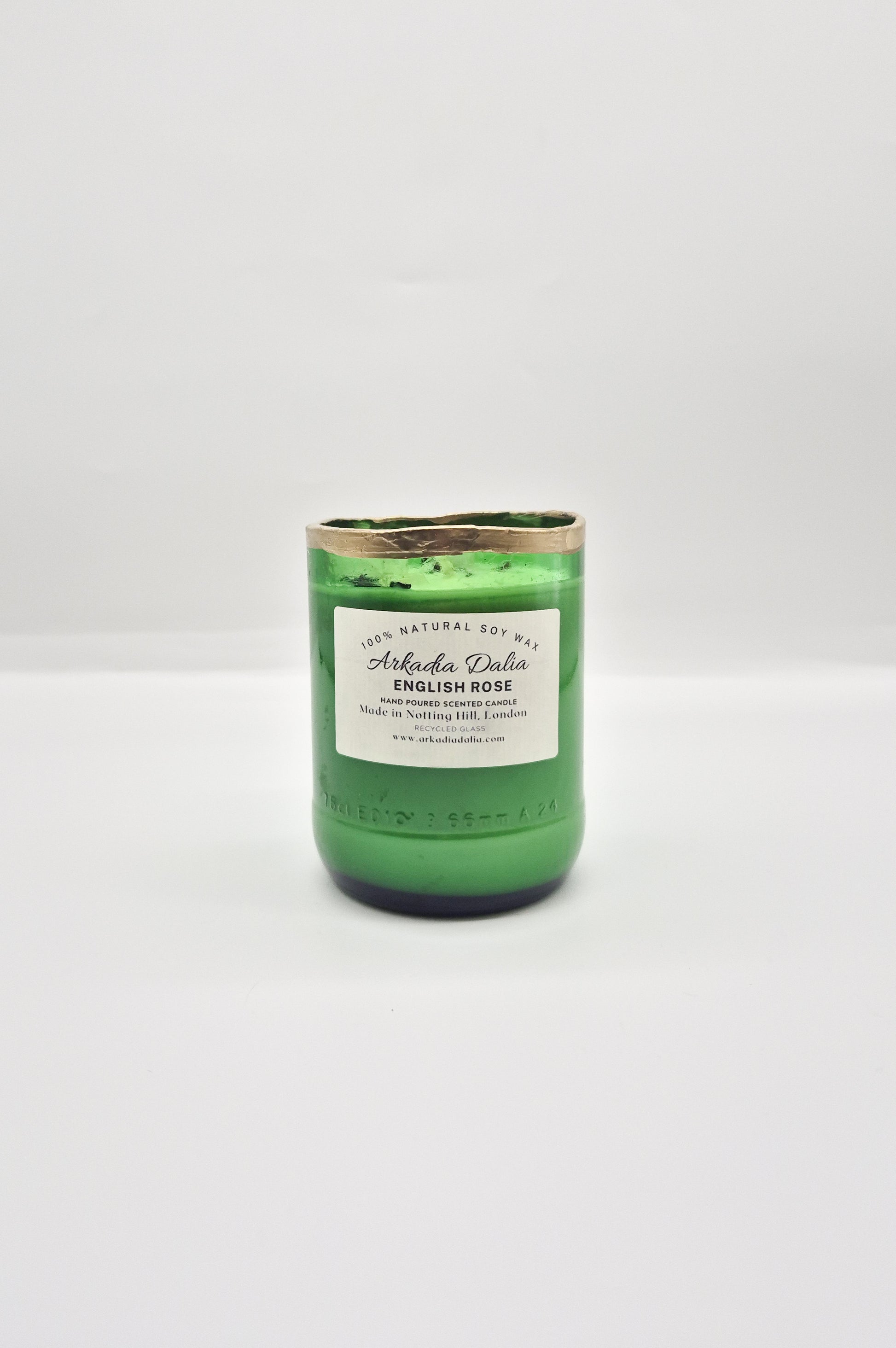 We make our own glass container from recycled glass bottles. Each container is hand painted.