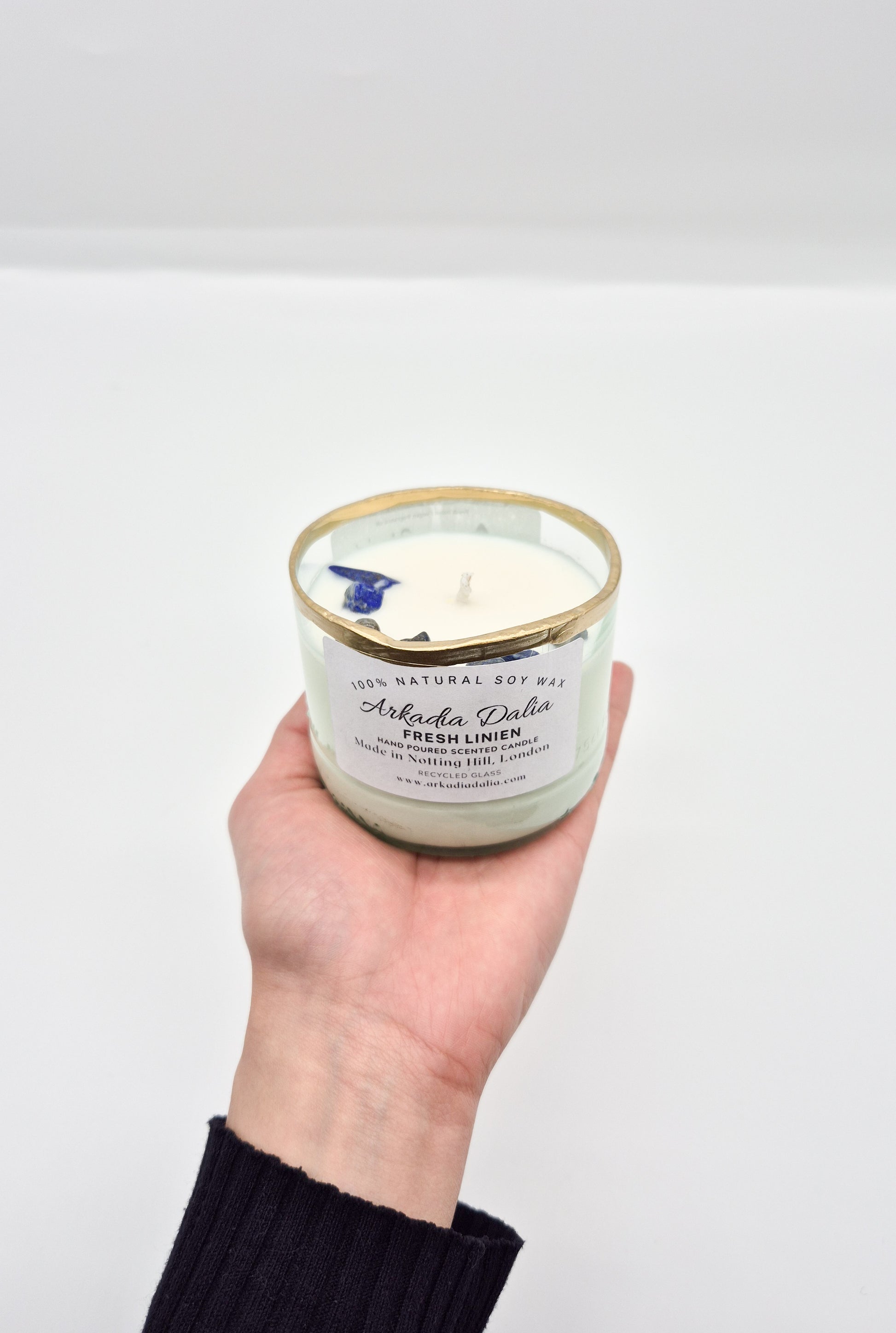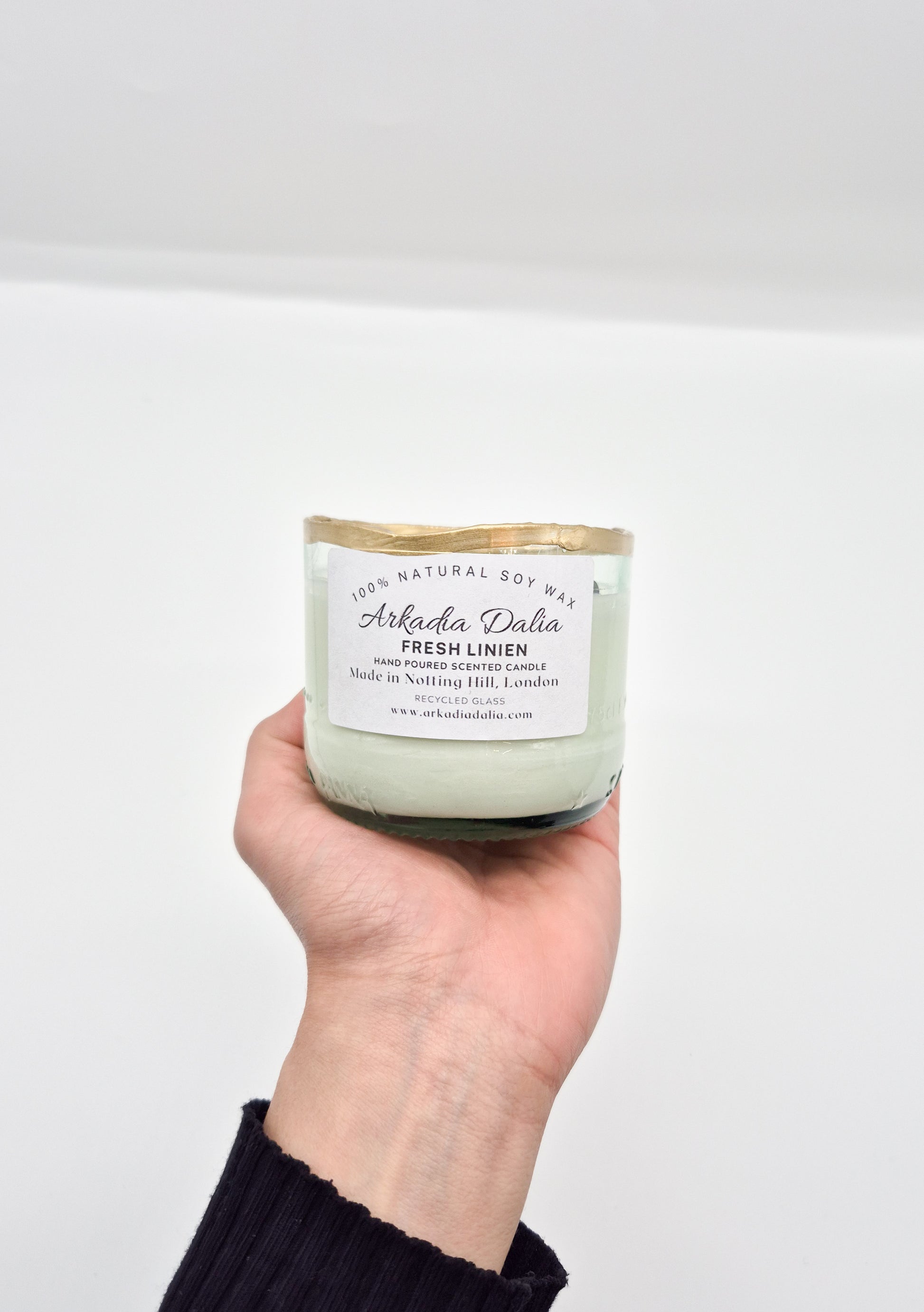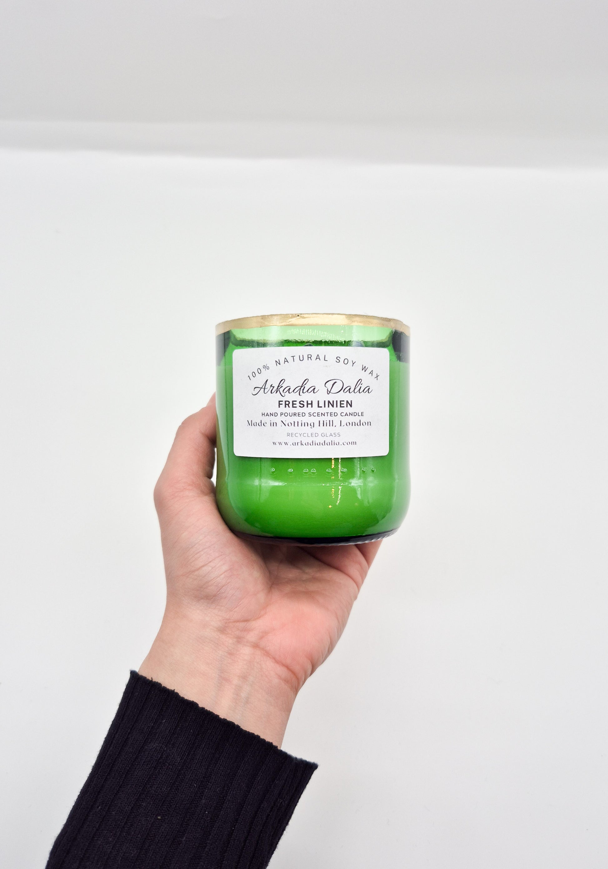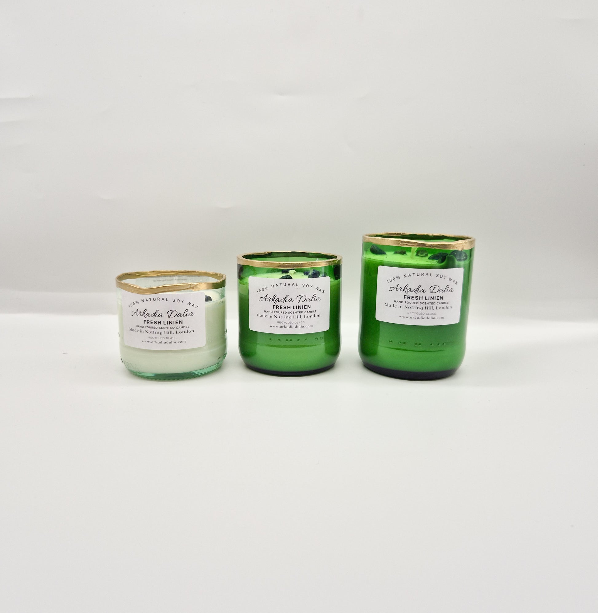 We make our own glass container from recycled glass bottles. Each container is decorated/painted by hand.