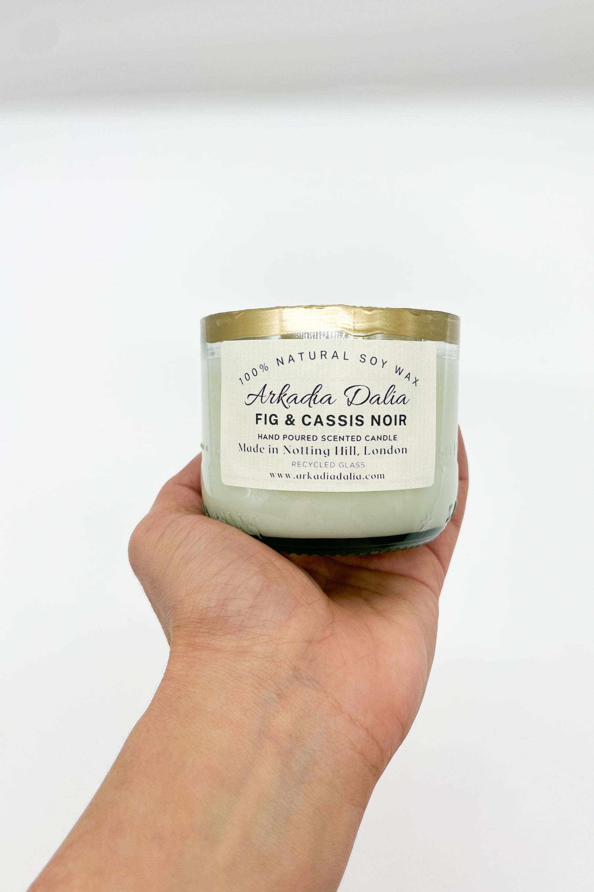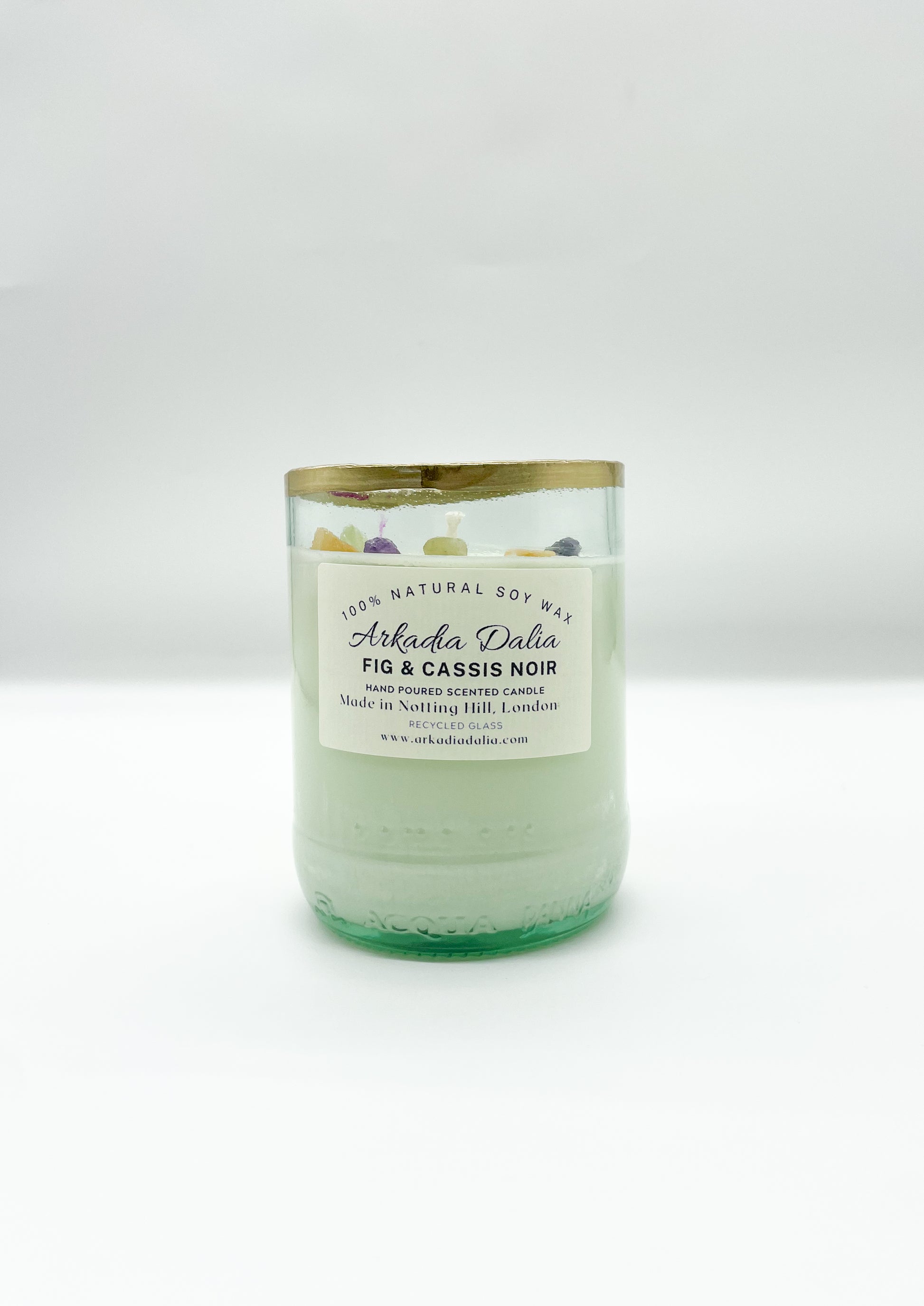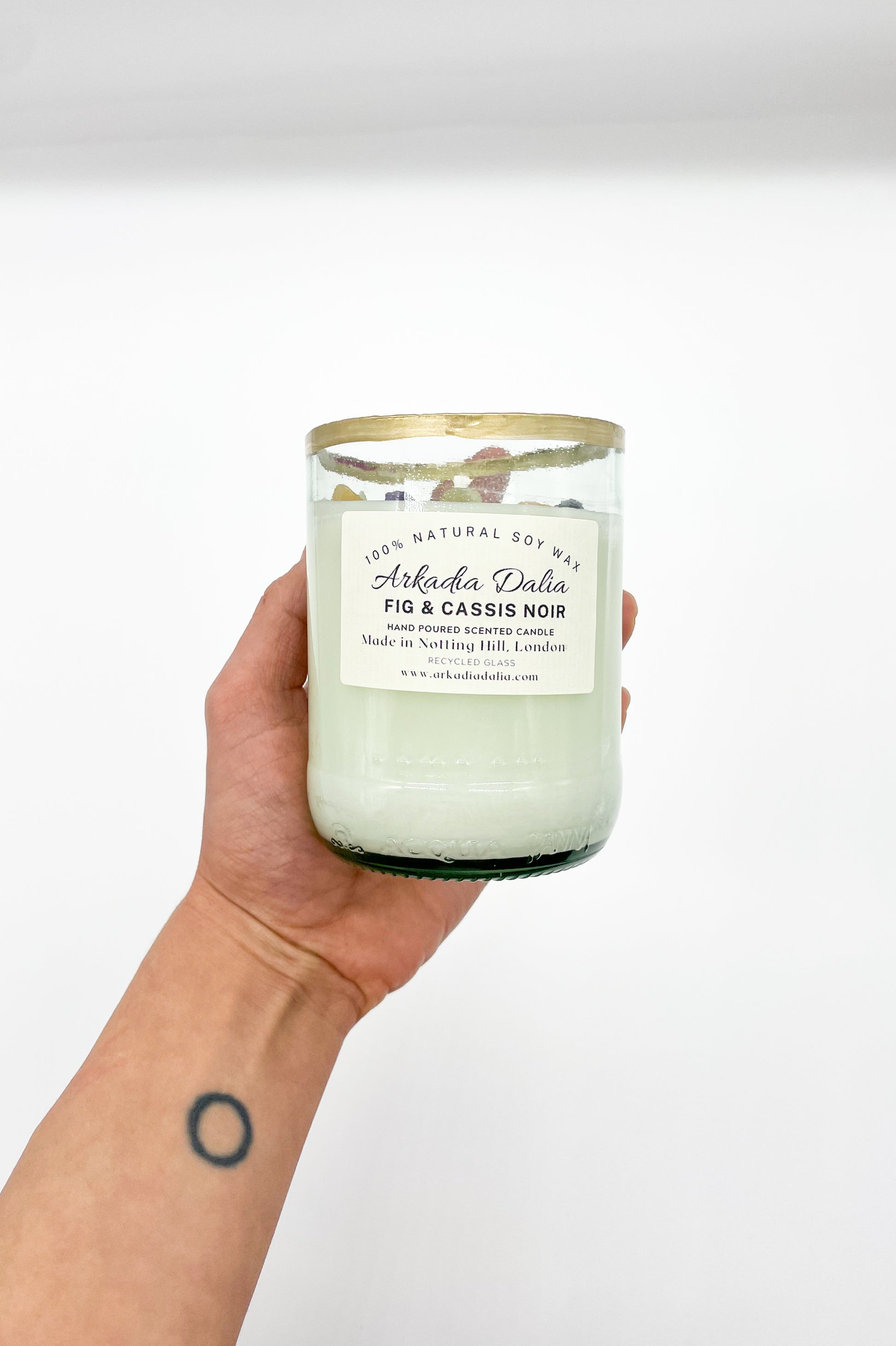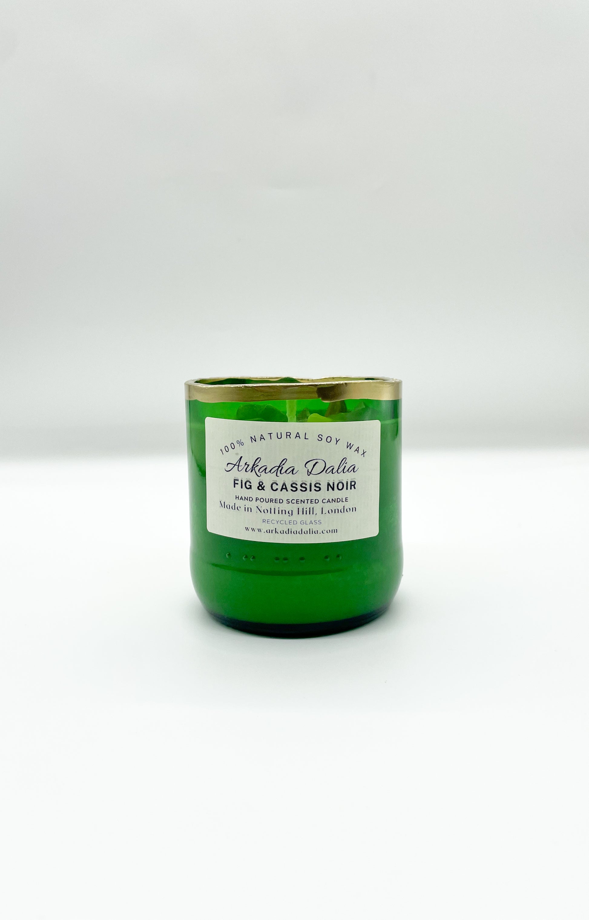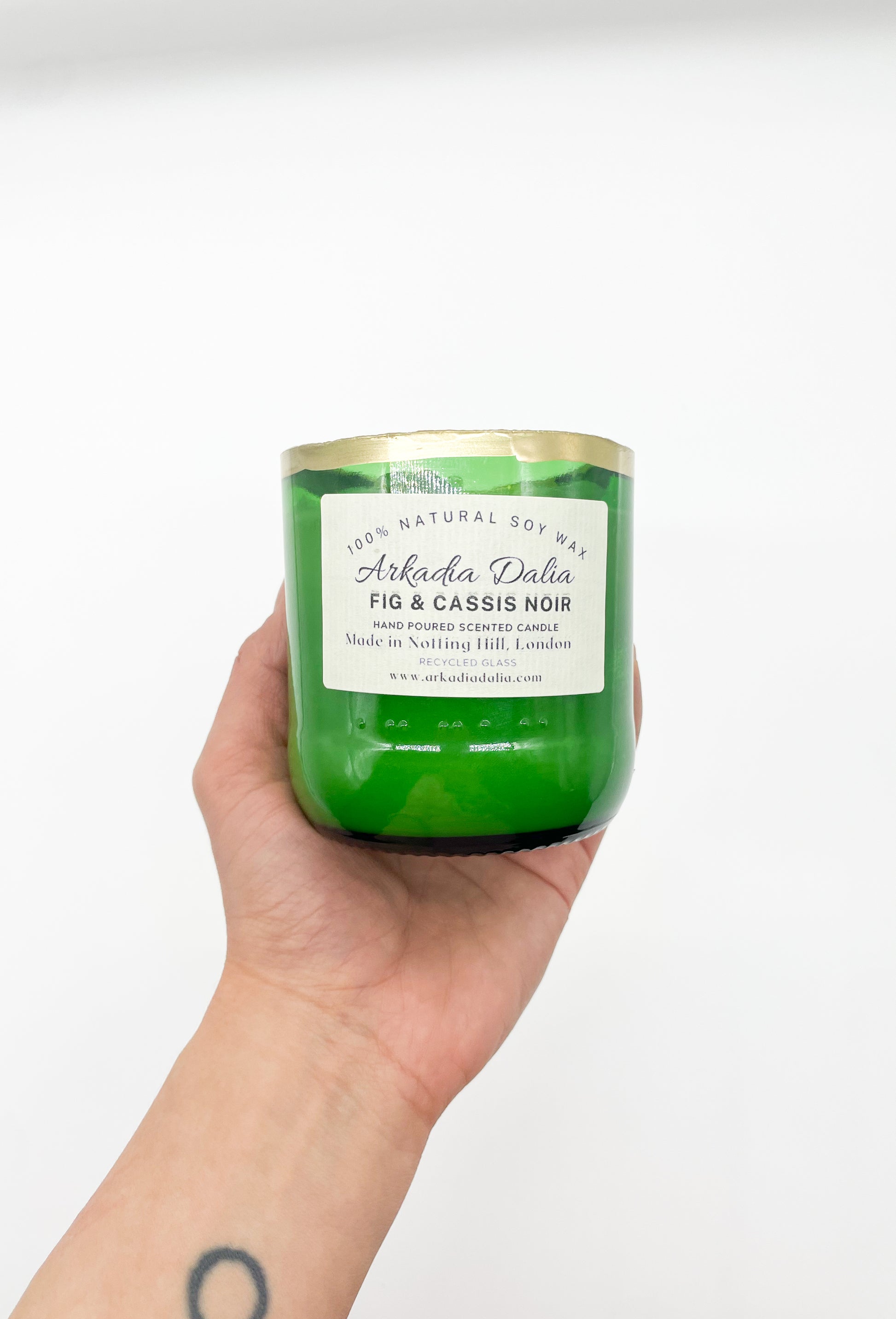We make our own glass container from recycled glass bottles. Each container is decorated/painted by hand.