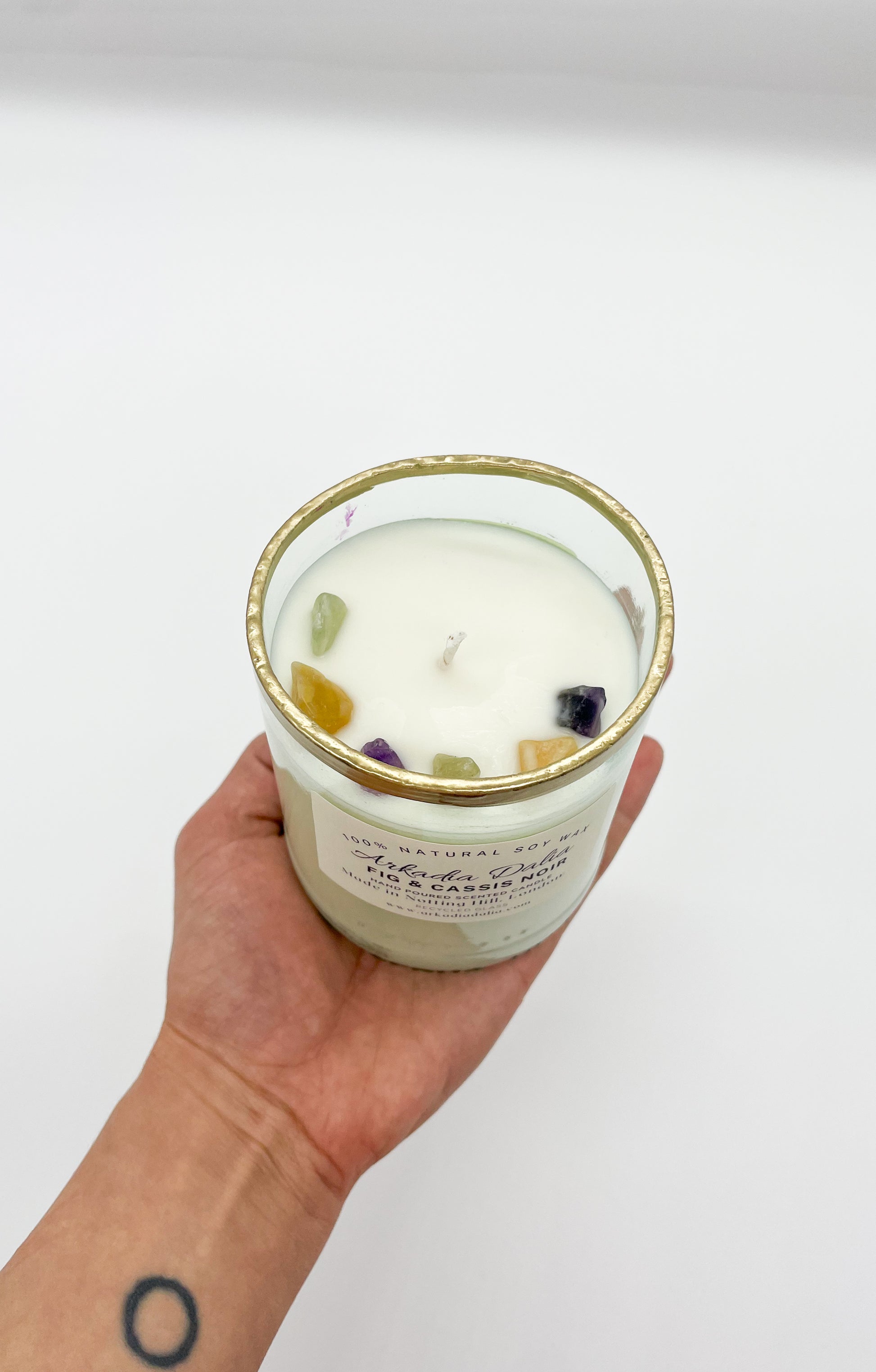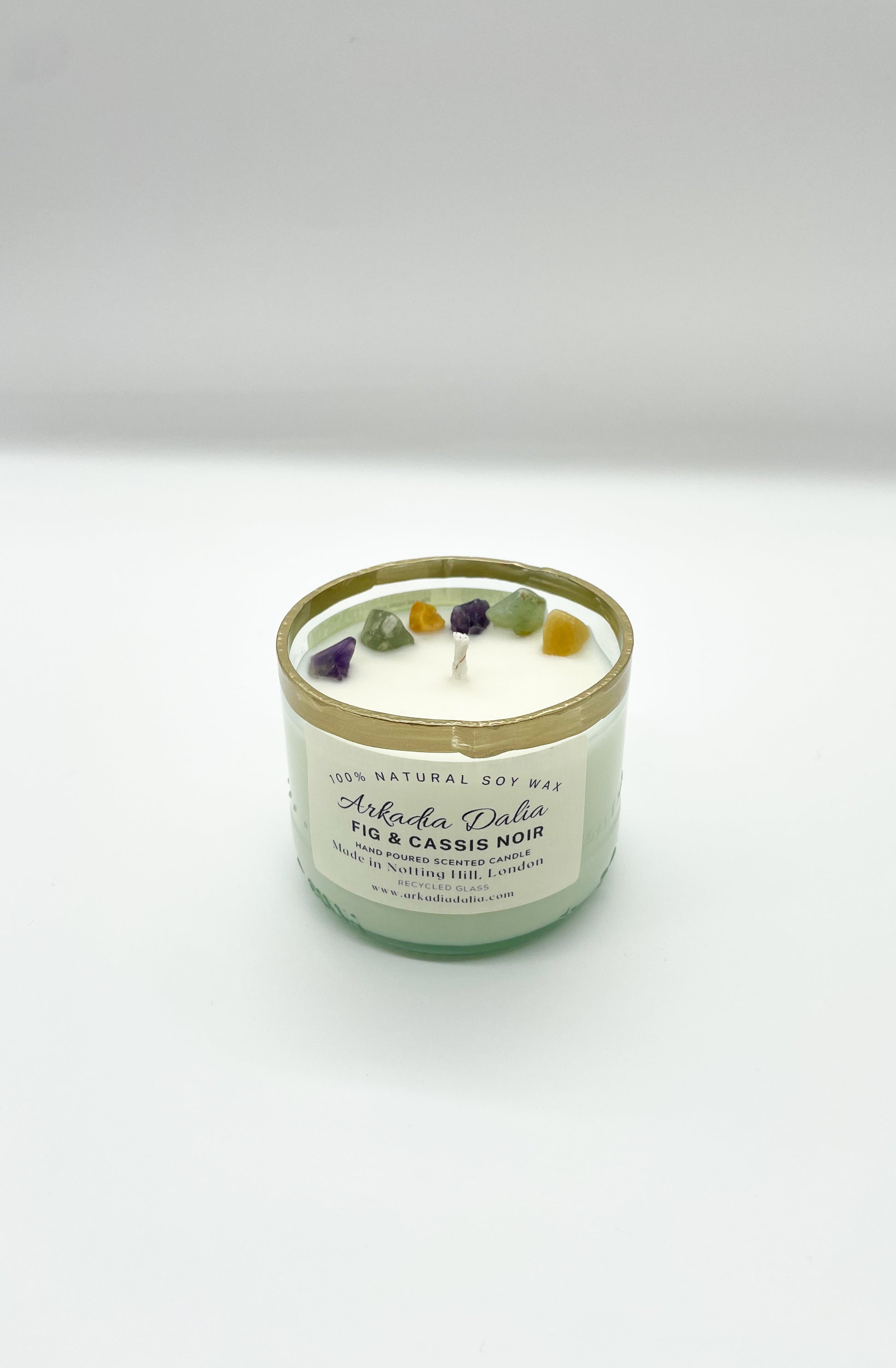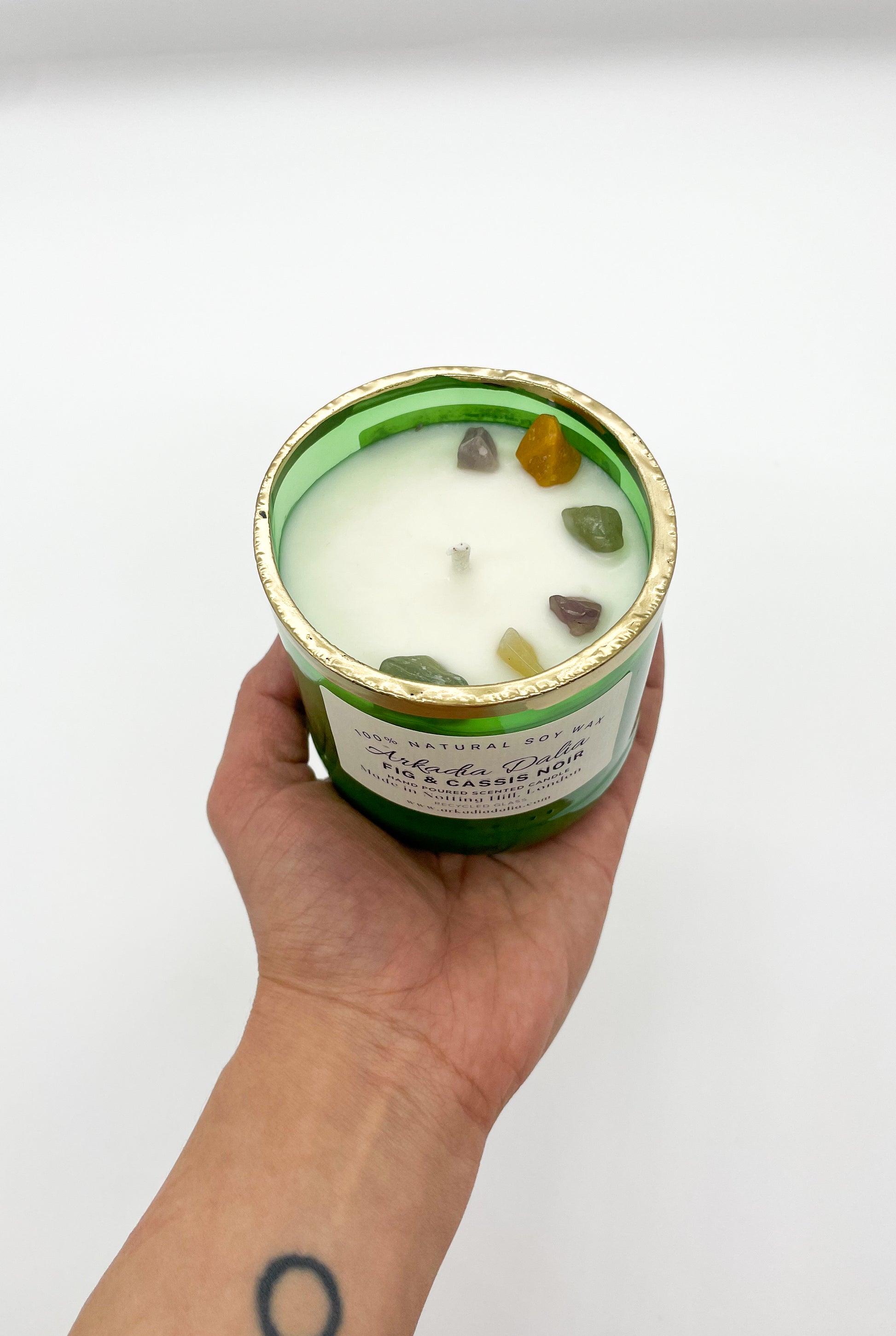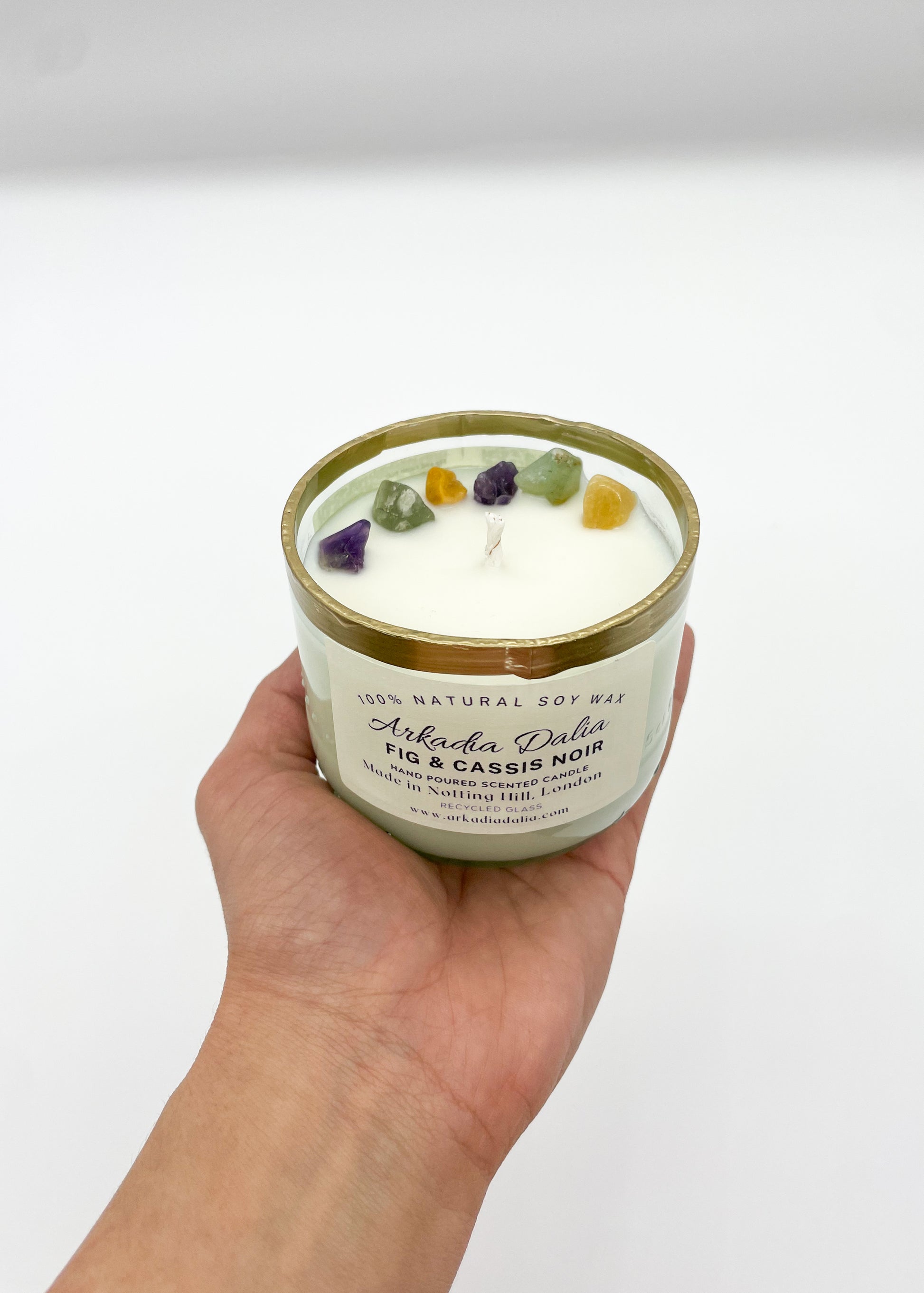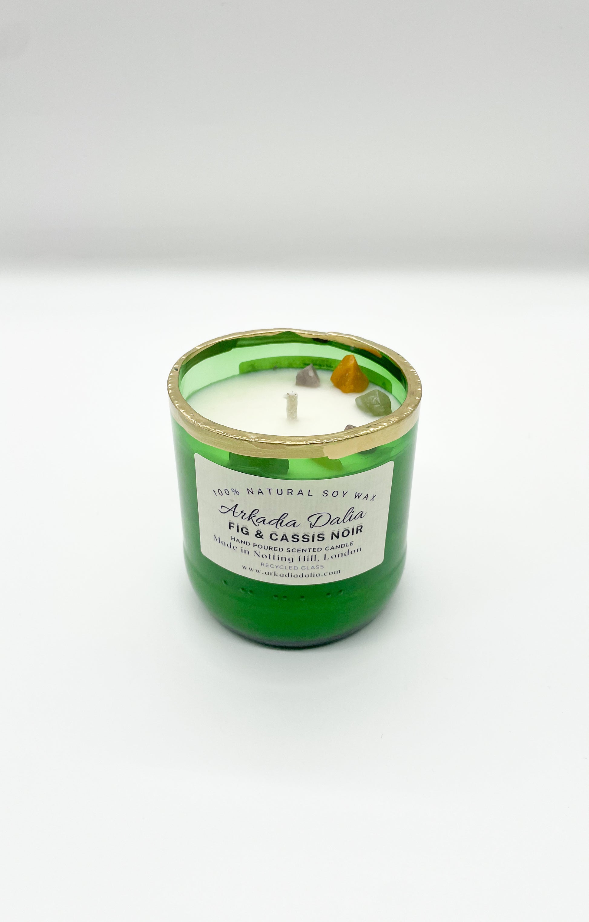 We make our own glass container from recycled glass bottles. Each container is decorated/painted by hand.