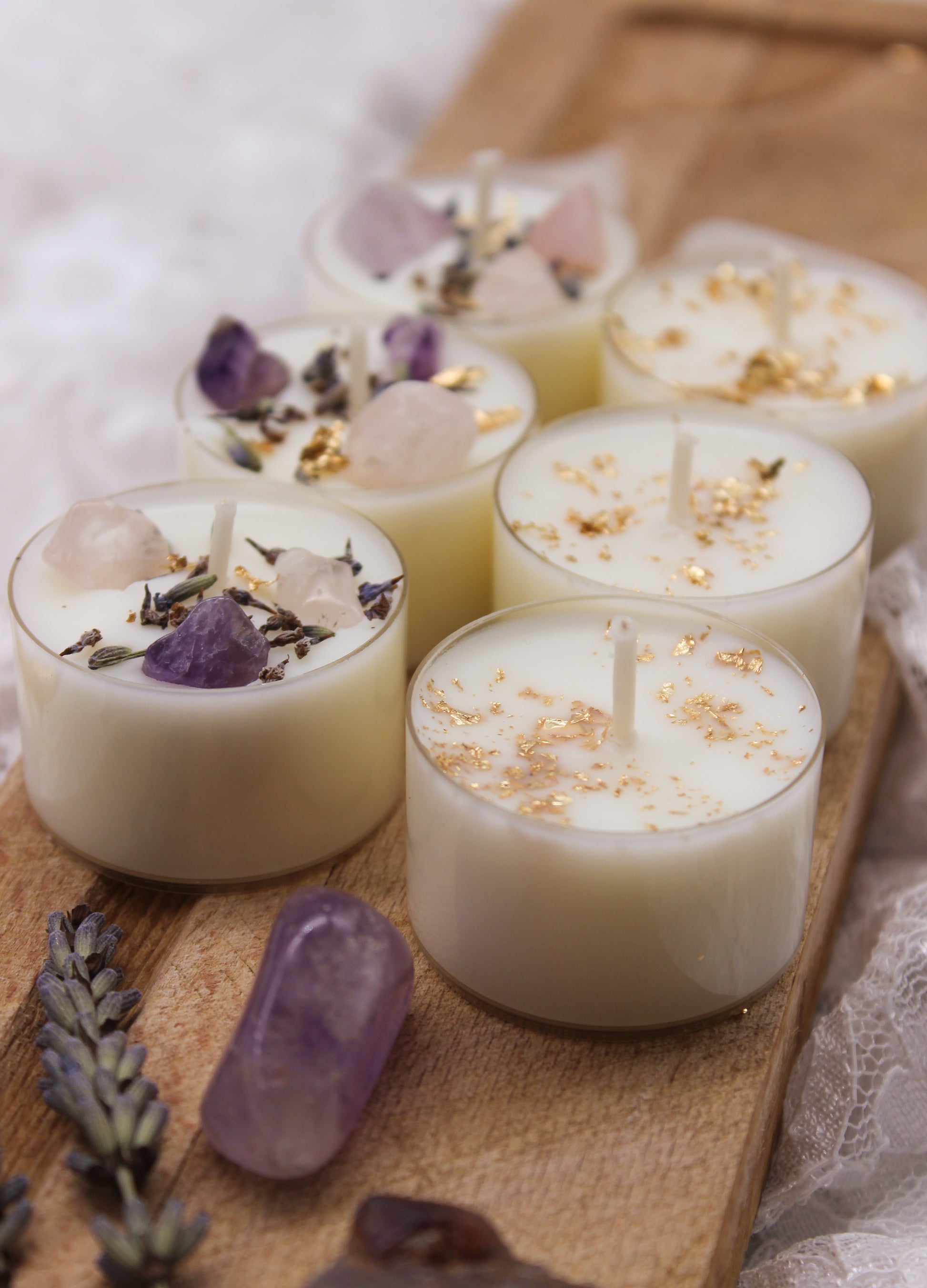 - 3 Lavender Tealights: Infused with pure lavender essential oil and adorned with dried lavender flowers, shimmering gold dust, rose quartz, and amethyst crystal chips for a calming and restorative ambiance.